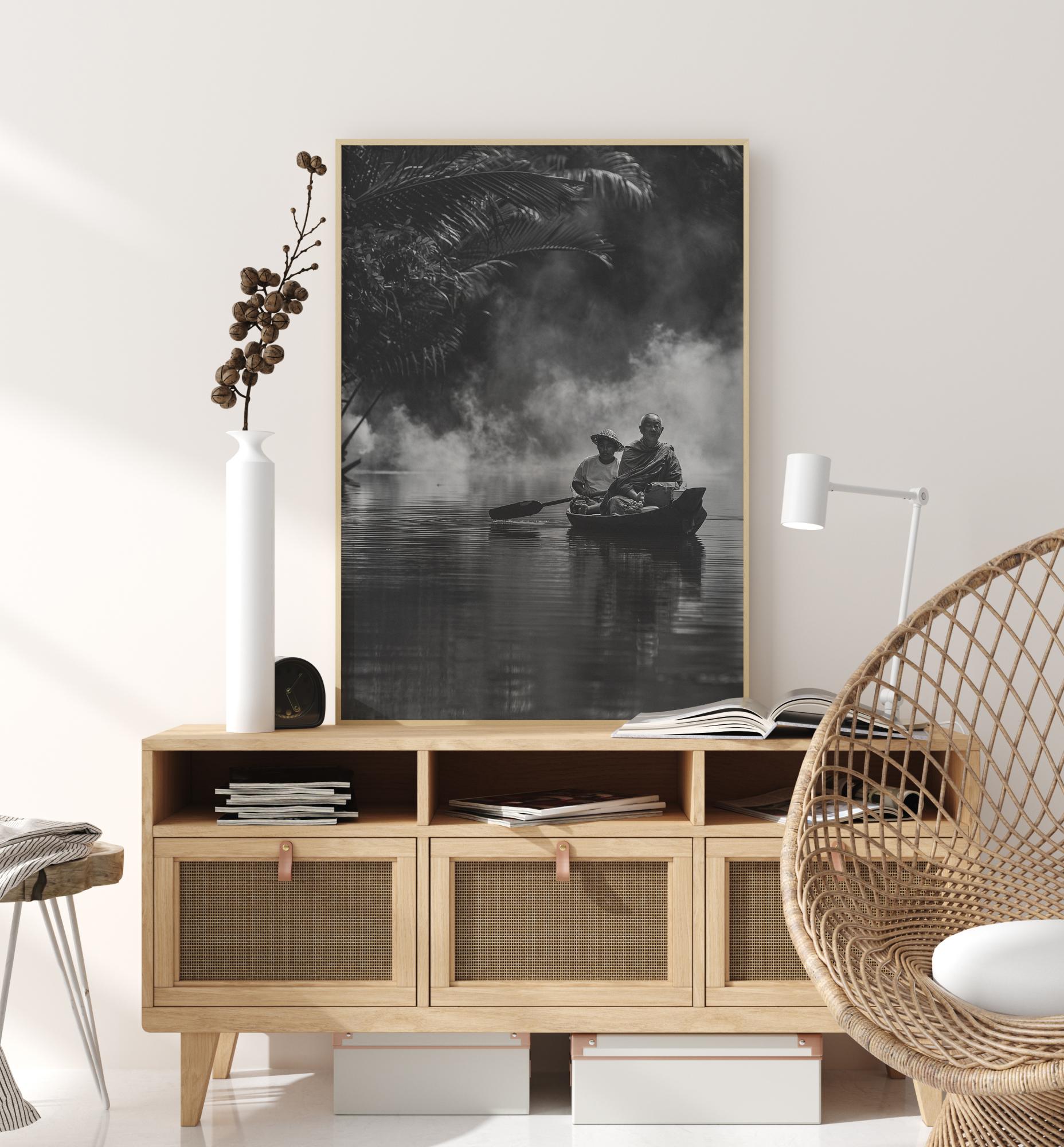 Ein friedliches Schwarz-Weiß-Foto in Nahaufnahme von zwei Männern, die einen Fluss hinunterfahren. Die beiden Männer sitzen friedlich auf ihrem thailändischen Gondel-Fischerboot und scheinen ihre Umgebung zu beobachten. Das natürliche Sonnenlicht, das durch die Wolken scheint, reflektiert das Boot auf dem Wasser. Man kann die Stille in diesem Bild fast hören. Ideal für eine ruhige Umgebung.