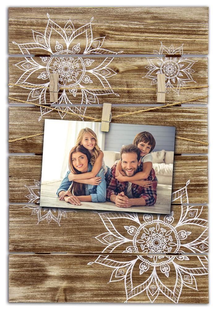 Ein etwas anderer, sehr dekorativer Collagerahmen für 2 Bilder im Format 10x15 cm. Der Bilderrahmen ist mit niedlichen Holzklammern ausgestattet, um die Bilder vor einem Hintergrund aus Holz mit weißen Blüten im Boheme-Stil zu befestigen. Die Außenmmaße des Bilderrahmens betragen 32x48,5 cm. Dieser Collagerahmen lässt sich wunderbar mit anderen Bildern oder sonstiger Wanddekoration für ein stilvolles Ambiente und ein stimmiges Gesamtbild kombinieren. Der Collage-Bilderrahmen ist mit einer Wandhalterung ausgestattet.