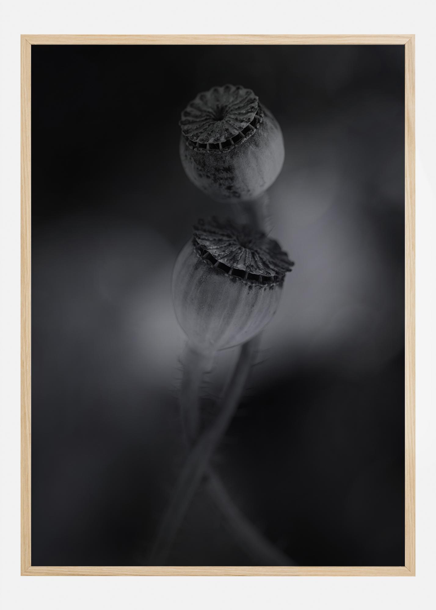 Ein unglaublicher schwarz-weißer Nahaufnahme-Druck von zwei alten Mohnblumen. Die beiden alten Mohnblumen sind ineinander verschlungen und stehen für sich allein. Das natürliche Licht schafft einen unscharfen schwarzen Hintergrund, der die Schönheit der Mohnblumen hervorhebt. Bringen Sie mit diesem Bild einen Hauch von Ruhe in Ihr Zuhause.
