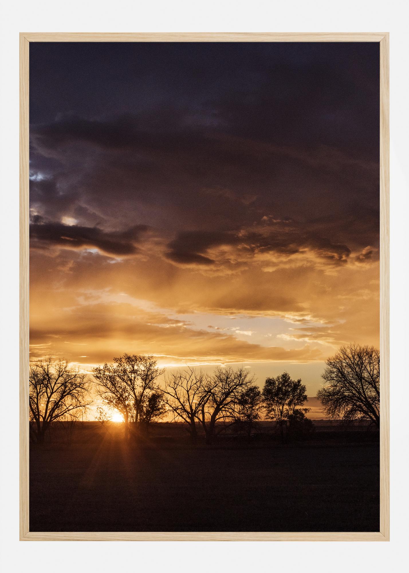 Ein atemberaubender Druck eines orangefarbenen Sonnenuntergangs. Der Sonnenuntergang am Horizont hebt die Herbstbäume auf den Feldern hervor. Der spektakuläre Himmel und die Orangetöne schaffen eine warme und beruhigende Atmosphäre. Ein atemberaubender Druck, der Wärme in Ihr Wohnzimmer bringt.