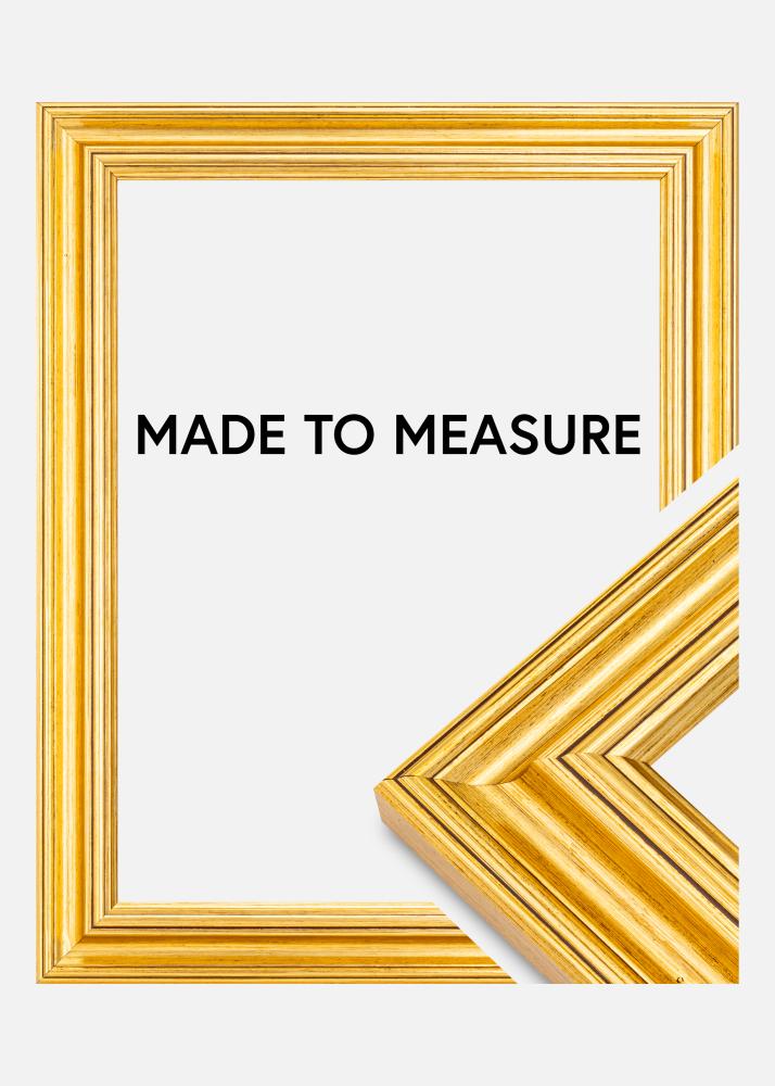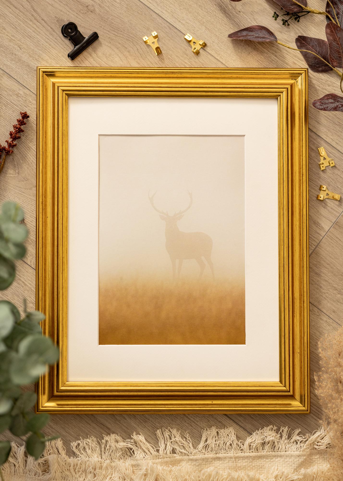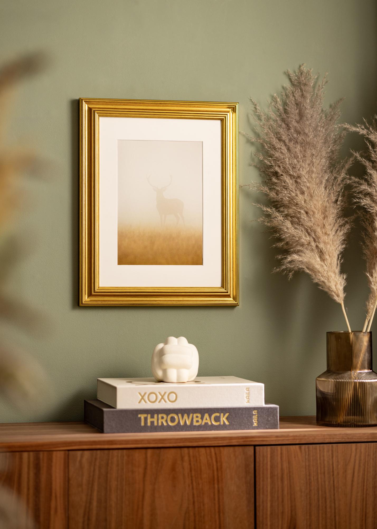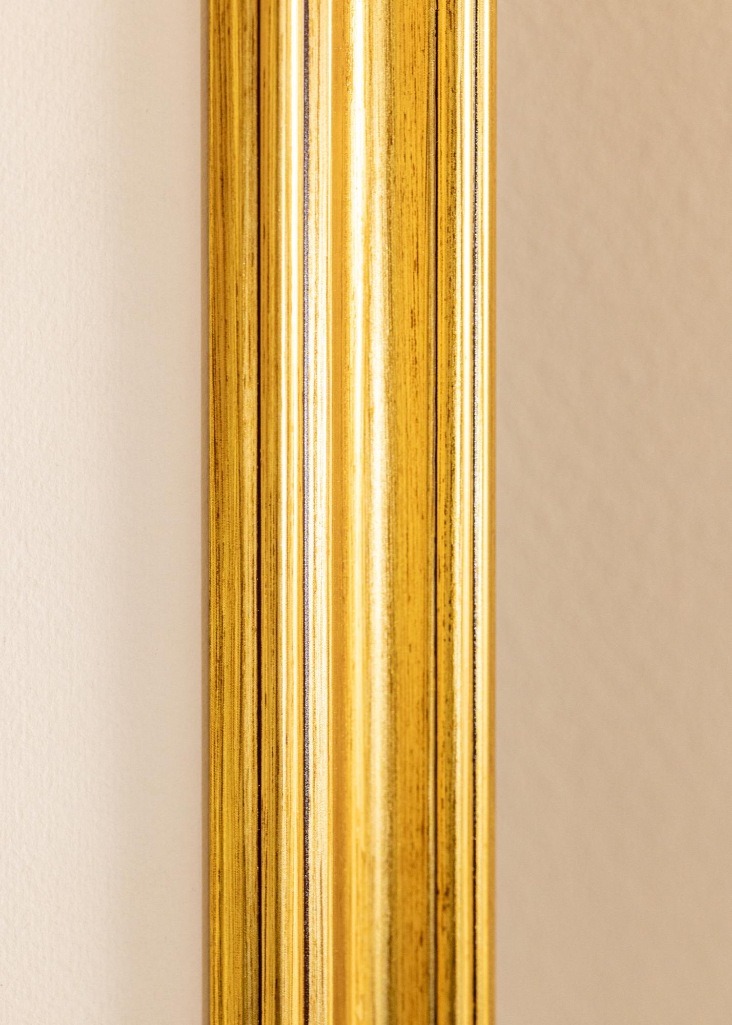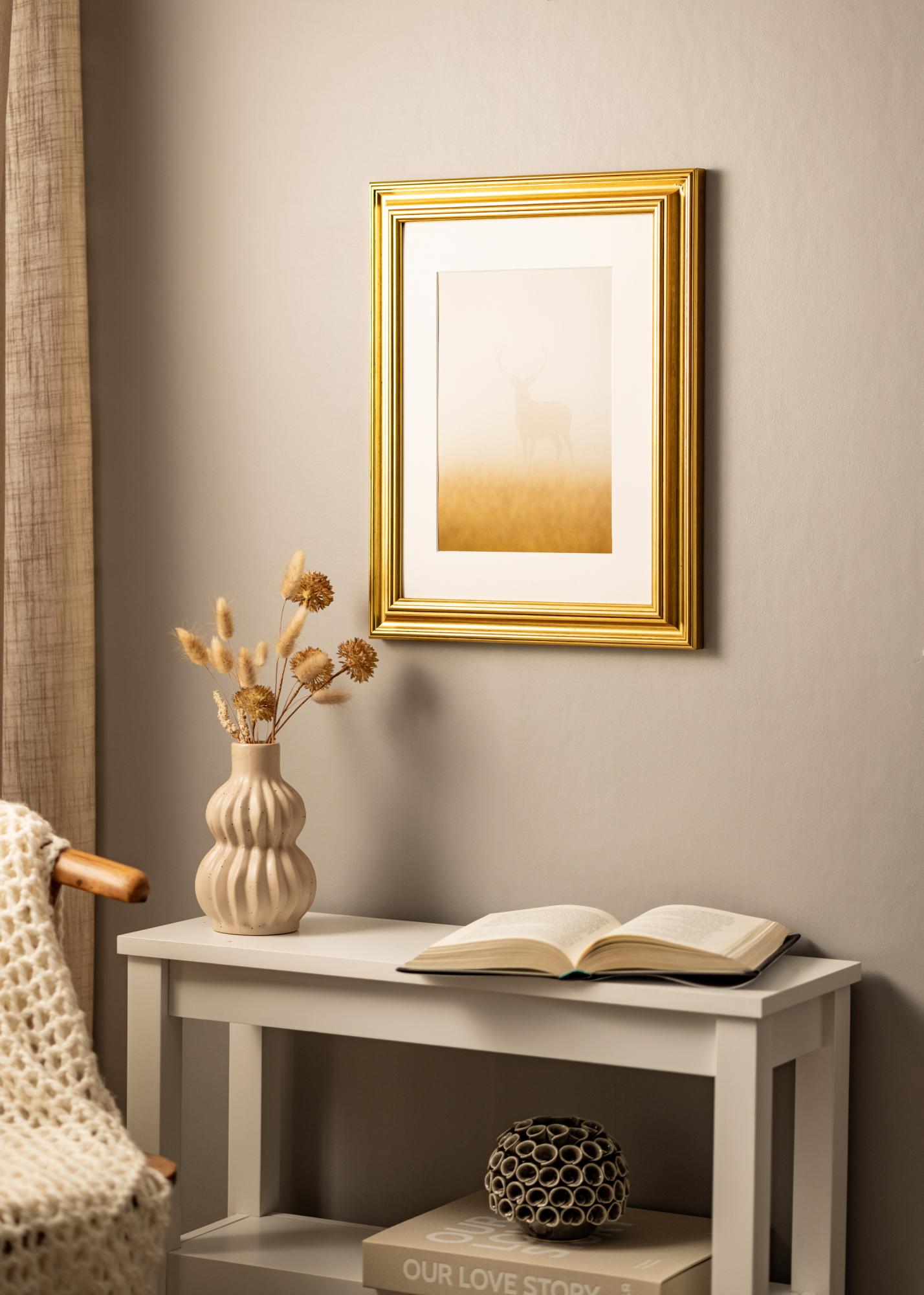 Exklusiver, klassisch profilierter, goldener Holzrahmen, der einen handbemalten Eindruck macht, wodurch sich der Bilderrahmen lebendig anfühlt und einen schönen Glanz erhält. Ein stilvoller Bilderrahmen, um Landschaftsmalereien sowie Porträts und Stillleben einzurahmen oder einen aufregenden Kontrast zu einem grafisch schlichten Poster zu schaffen. Goldene Bilderrahmen passen sowohl in eine antike Einrichtung als auch in eine Stadtwohnung, für die man sich eine elegante Note wünscht. Hänge mehrere Bilder in Goldrahmen mit unterschiedlichen Stilen zusammen, um eine Bilderwand zu erstellen.