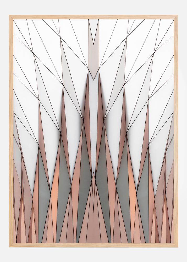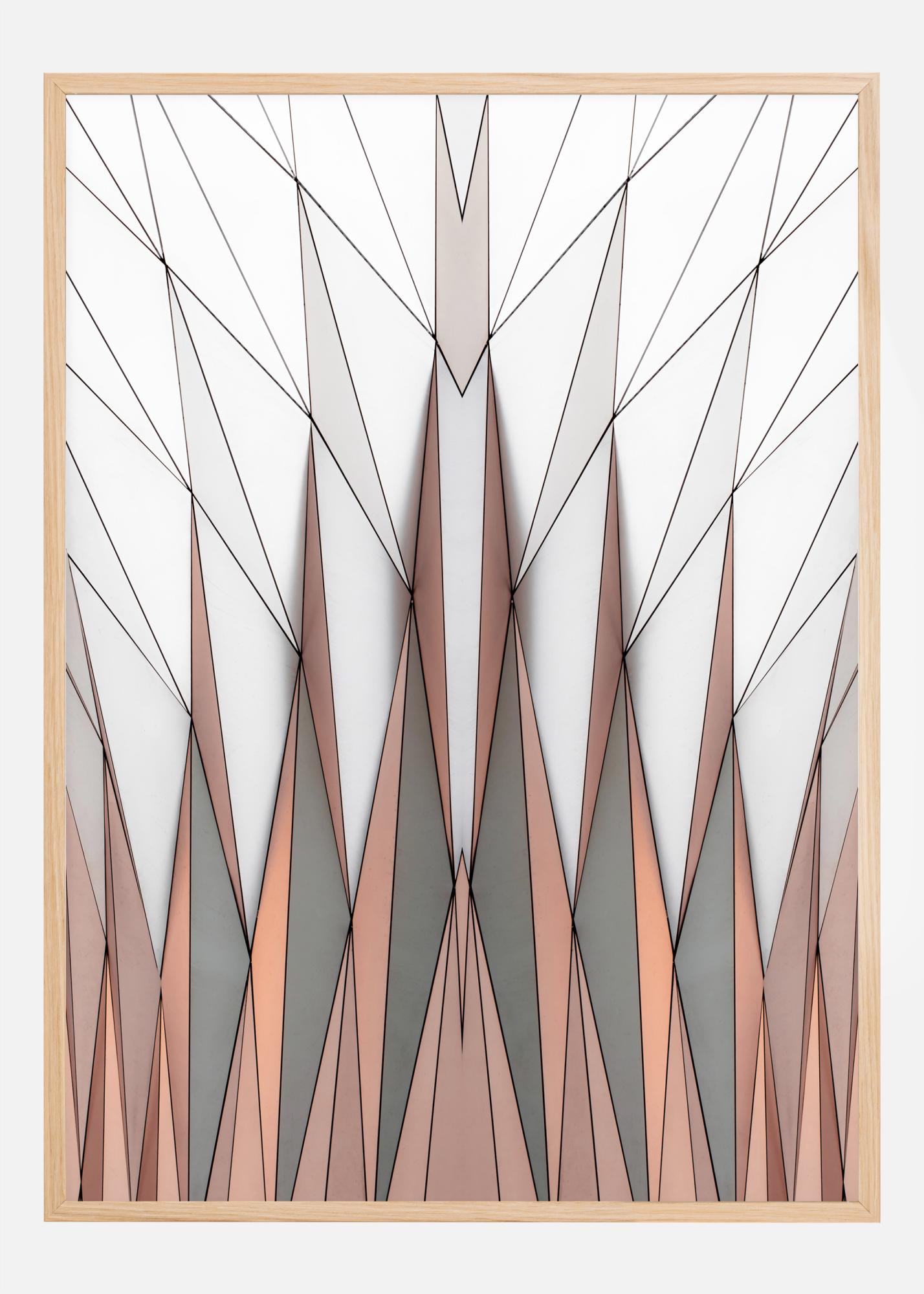 Ein wunderschöner Druck aus Dreiecken. Die orangefarbenen und grauen Dreiecke sind am unteren Rand des Drucks angeordnet und zeigen nach oben. Die übrigen rautenförmigen Dreiecke bedecken jedoch die obere Hälfte des Bildes. Ein großartiges Bild, wenn Sie den Eindruck von Raum vermitteln wollen. Ideal für eine Wohnzimmerwand.