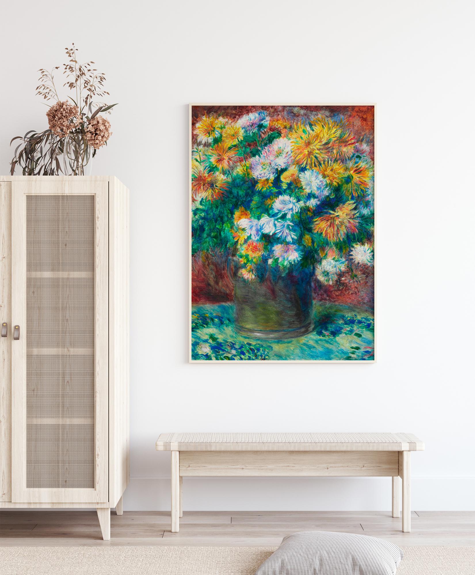 Ein farbenfroh gemaltes Poster eines Blumenstraußes. Auf einem mehrfarbigen Hintergrund schafft diese schöne Farbpalette eine fröhliche Atmosphäre. Die Blumen sind auf einer türkisfarbenen Tischdecke platziert, die die leuchtenden Farben dieses Drucks noch unterstreicht. Ein perfekter Druck für jeden, der Blumen liebt.
