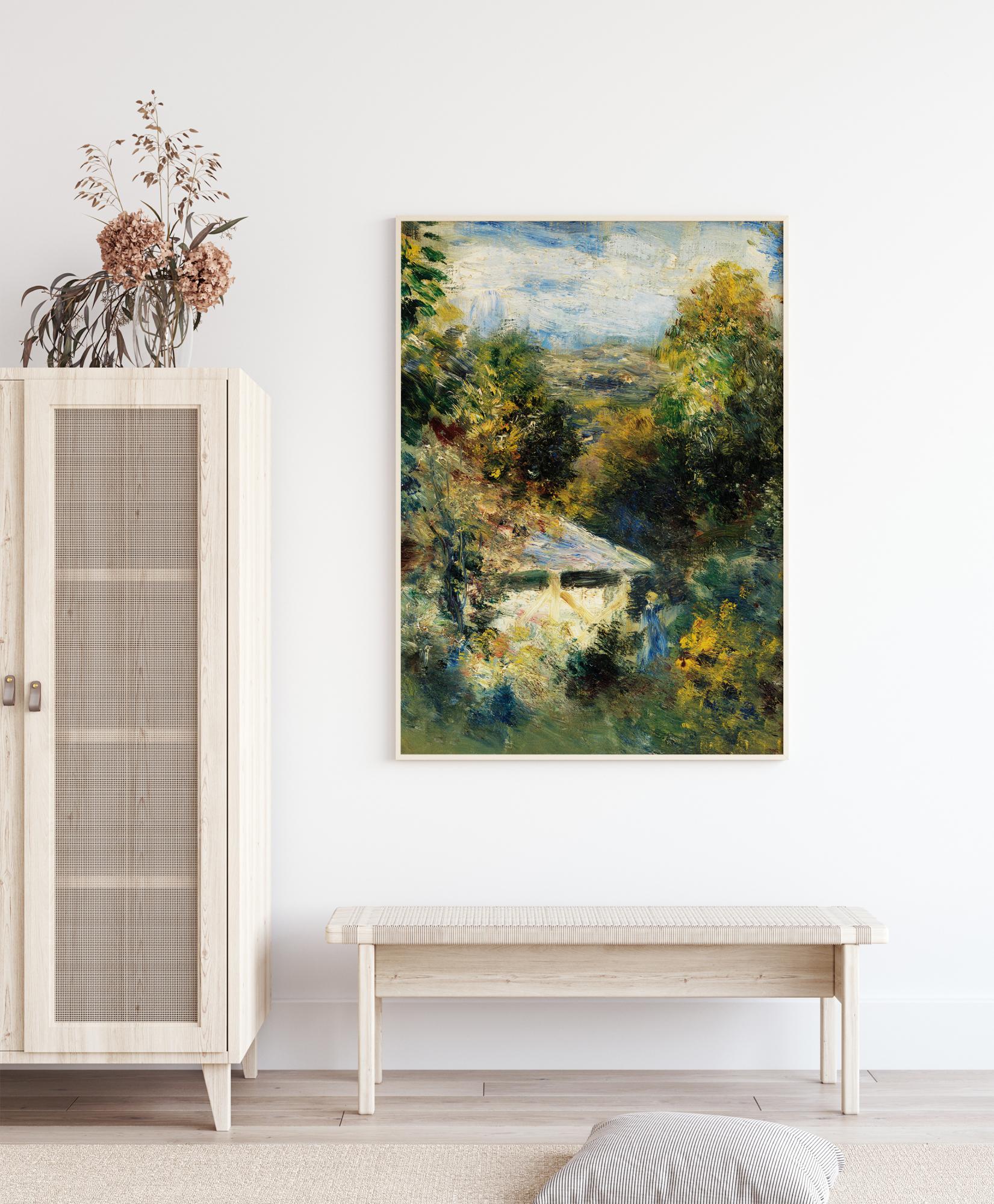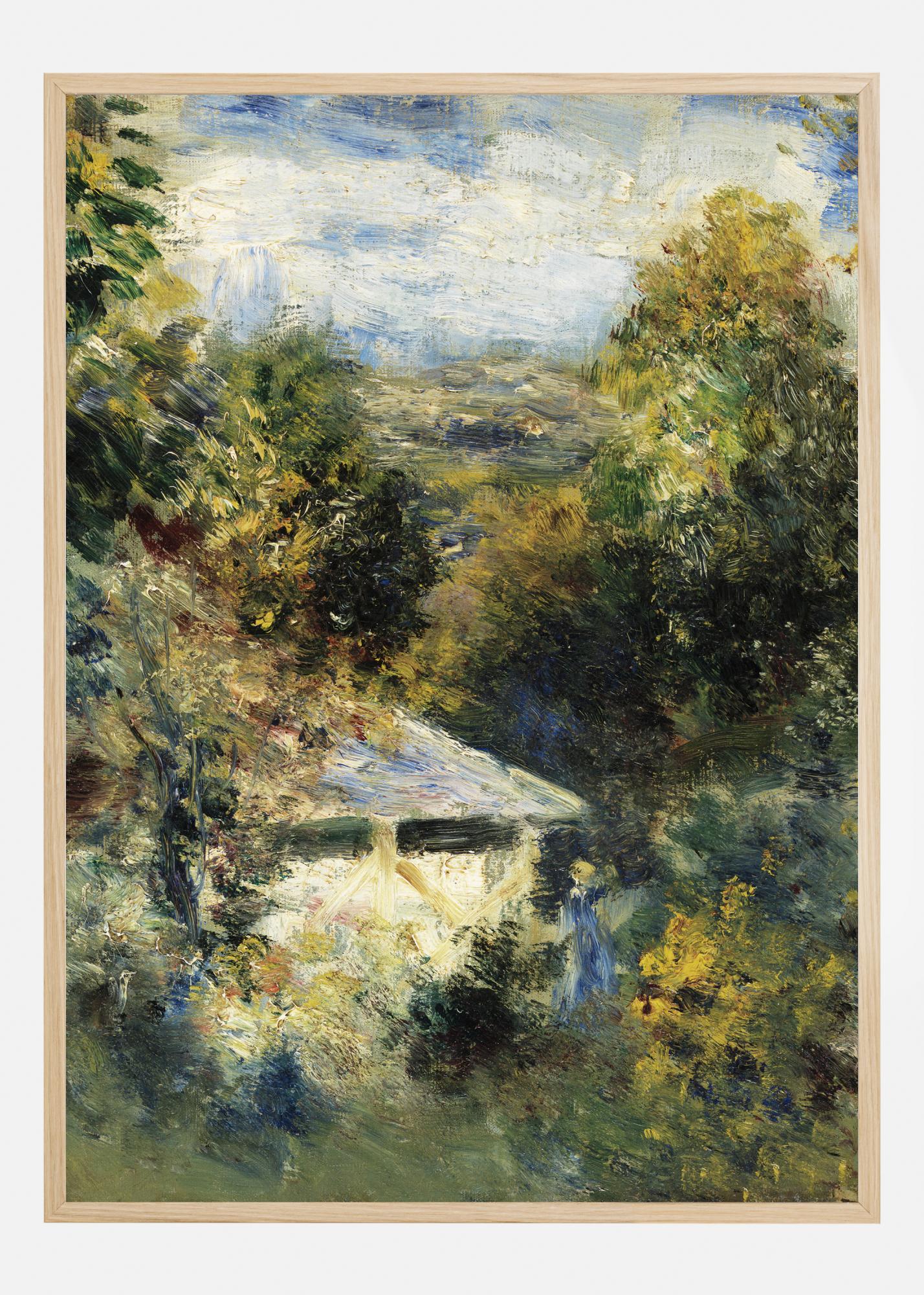 Ein reizvoller Landschaftsdruck. Eine schöne blaue Skyline, Braun-, Grün- und Gelbtöne schaffen eine warme Atmosphäre auf dem Lande. Eine in Blau gekleidete Frau steht neben einem verlassenen Haus und bewundert die Schönheit des Ortes. Bringen Sie etwas Farbe in Ihr Zuhause, indem Sie dieses schöne Kunstwerk aufhängen.