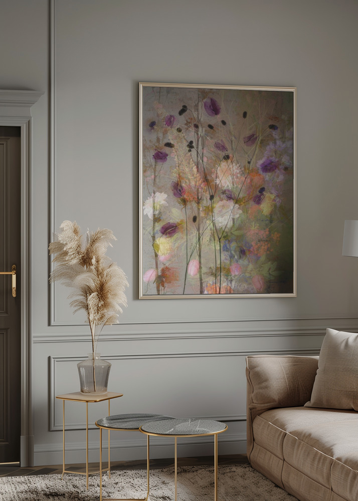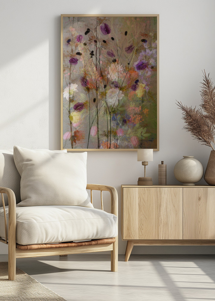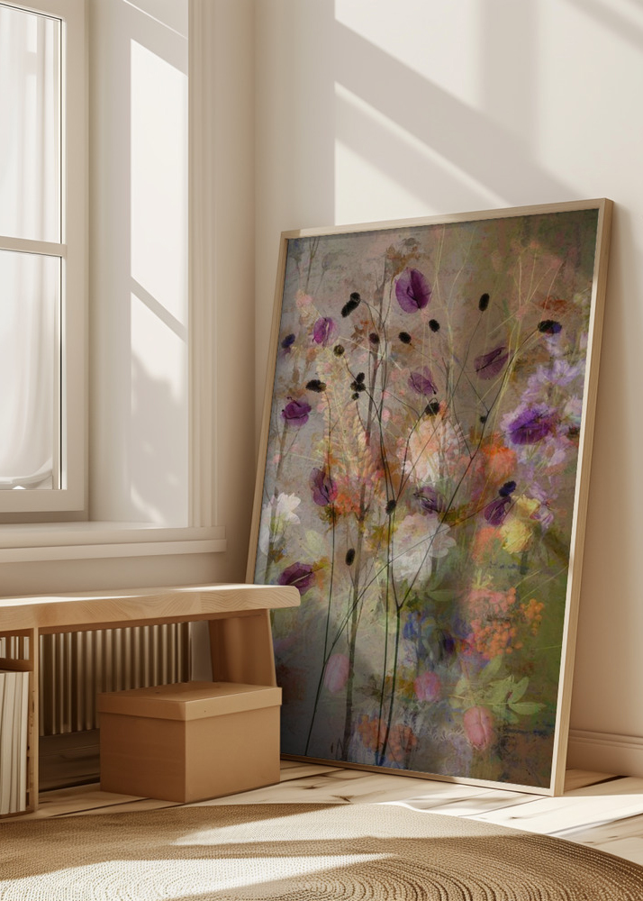 Ein wunderschöner handgemalter Druck mit lila und weißen Trockenblumen. Auf einem beigefarbenen Hintergrund schaffen die natürlichen Farben der Blumen eine entspannende Atmosphäre. Die sanften Grün-, Violett- und Orangetöne sind sehr angenehm für das Auge. Ein schöner Druck, den Sie neben Ihrem Schminktisch aufhängen können.
