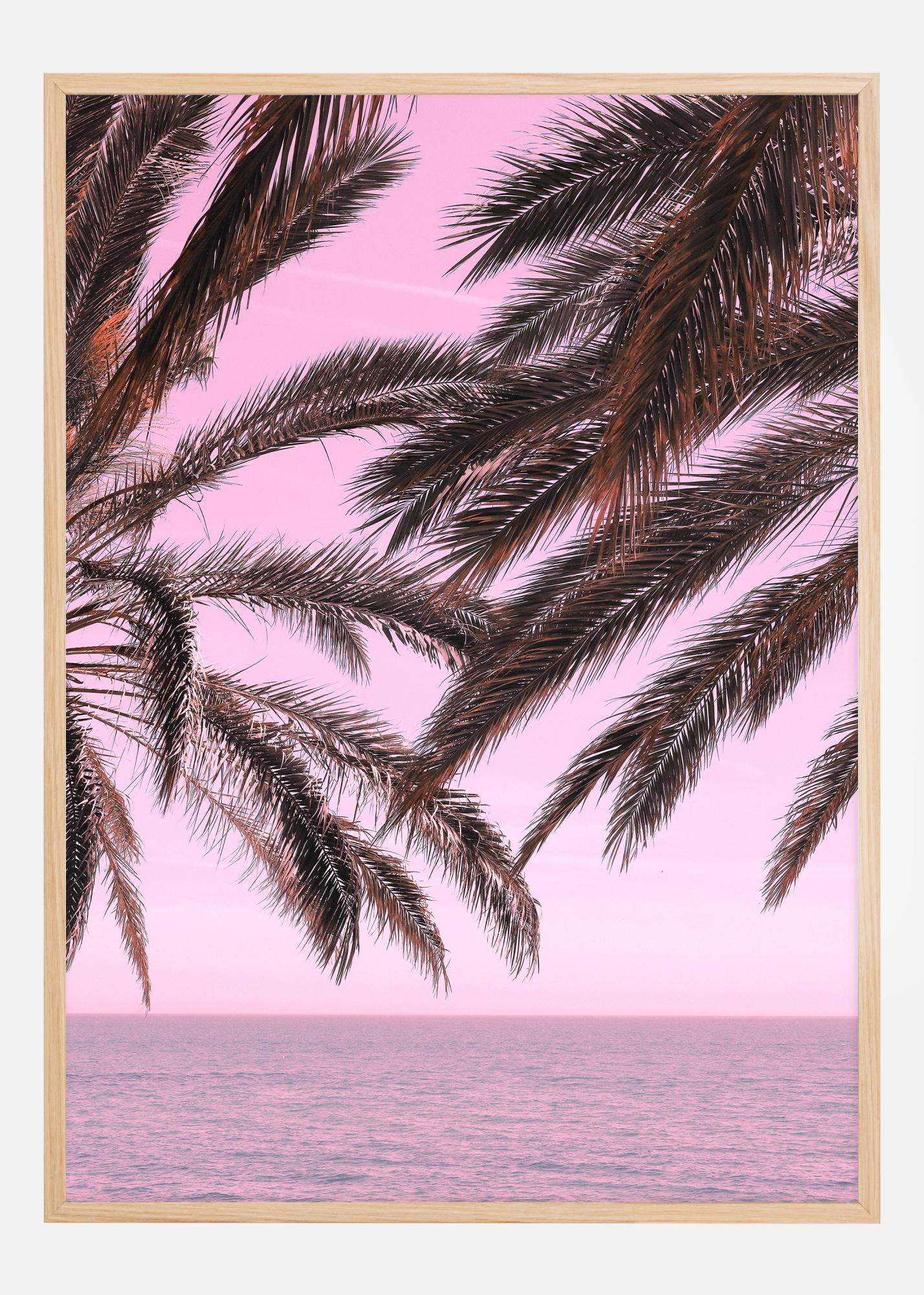 Fangen Sie die Essenz eines Sonnenuntergangs am Strand mit diesem faszinierenden Poster ein, das üppige Palmblätter vor einem sanften rosa Himmel darstellt. Der Druck lädt zu Träumen von tropischen Klimazonen und entspannten Tagen am Meer ein. Die dunklen Palmblätter bilden eine elegante Silhouette, die im Kontrast zur beruhigenden Farbpalette von Himmel und Meer steht, wodurch ein Gefühl von Ruhe und Wohlbefinden hervorgerufen wird.