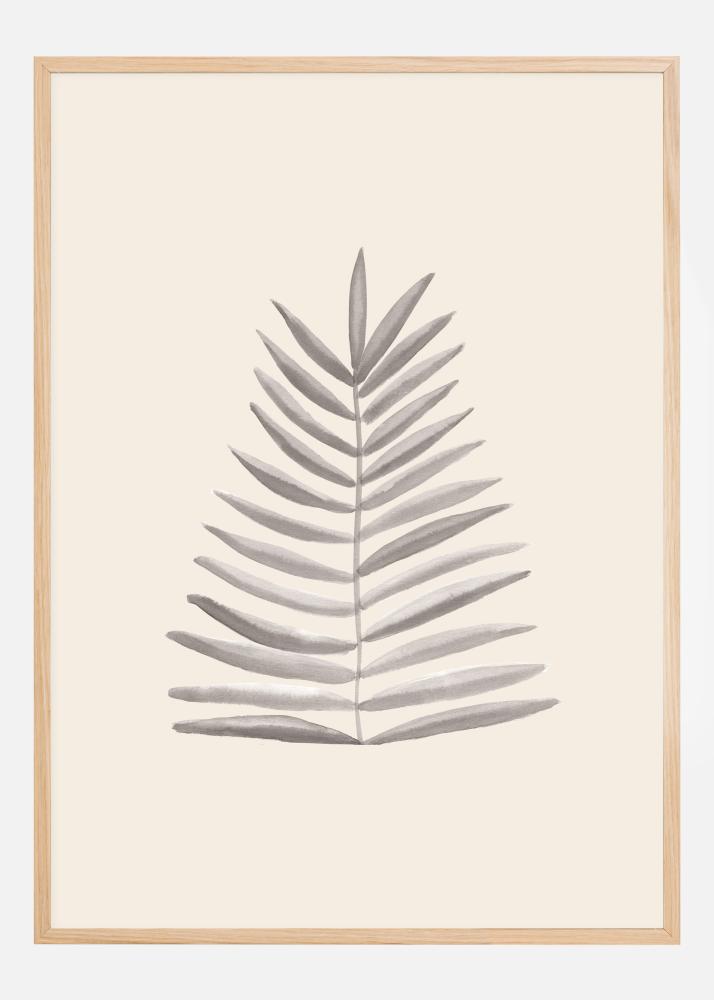 Ein einfacher, aber klarer Druck eines Palmenblatts. Das Blatt ist auf einer cremefarbenen Oberfläche gezeichnet und steht aufrecht auf seiner Mittelrippe. Der cremefarbene Untergrund hebt das kleine braune Palmenblatt hervor. Fügen Sie einer farbigen Wand diesen Hauch von Klasse hinzu.