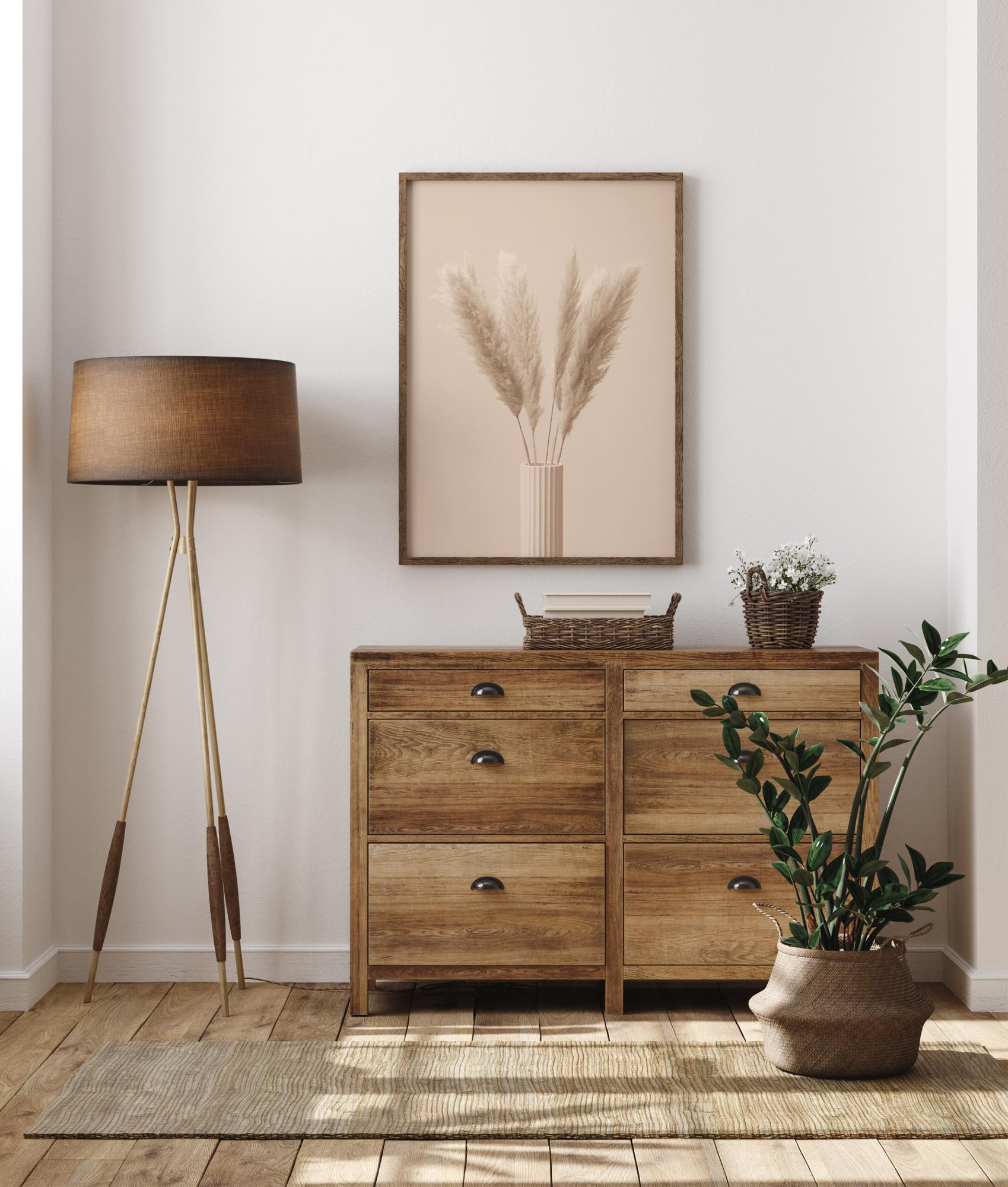 Ein Blumenposter mit Pampasgras in einer Vase. Die Grasköpfe heben sich von dem rosafarbenen Sepia-Hintergrund ab und machen die Vase weich. Ein Hauch von Eleganz für Ihr Zuhause.