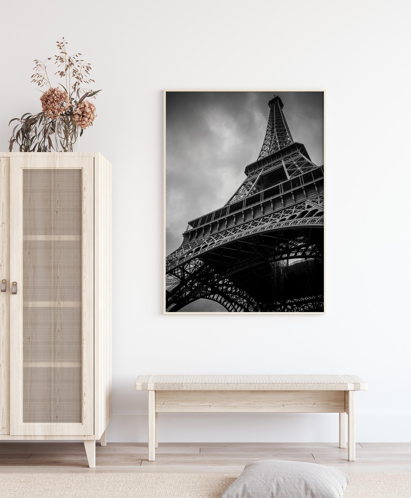 Ein perspektivischer Druck des atemberaubenden Eiffelturms von unten nach oben. Vor einem wolkenverhangenen, grauen Himmel erhebt sich dieses wunderschöne Bauwerk aus Eisenpfützen in seiner pyramidenartigen Form. Dieses Bild ist ein ideales Geschenk für alle Paris-Liebhaber.