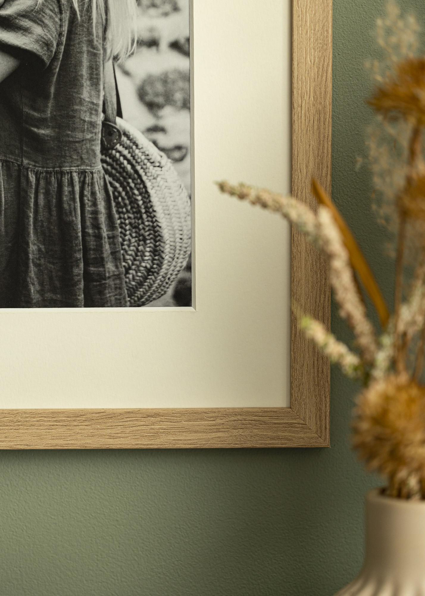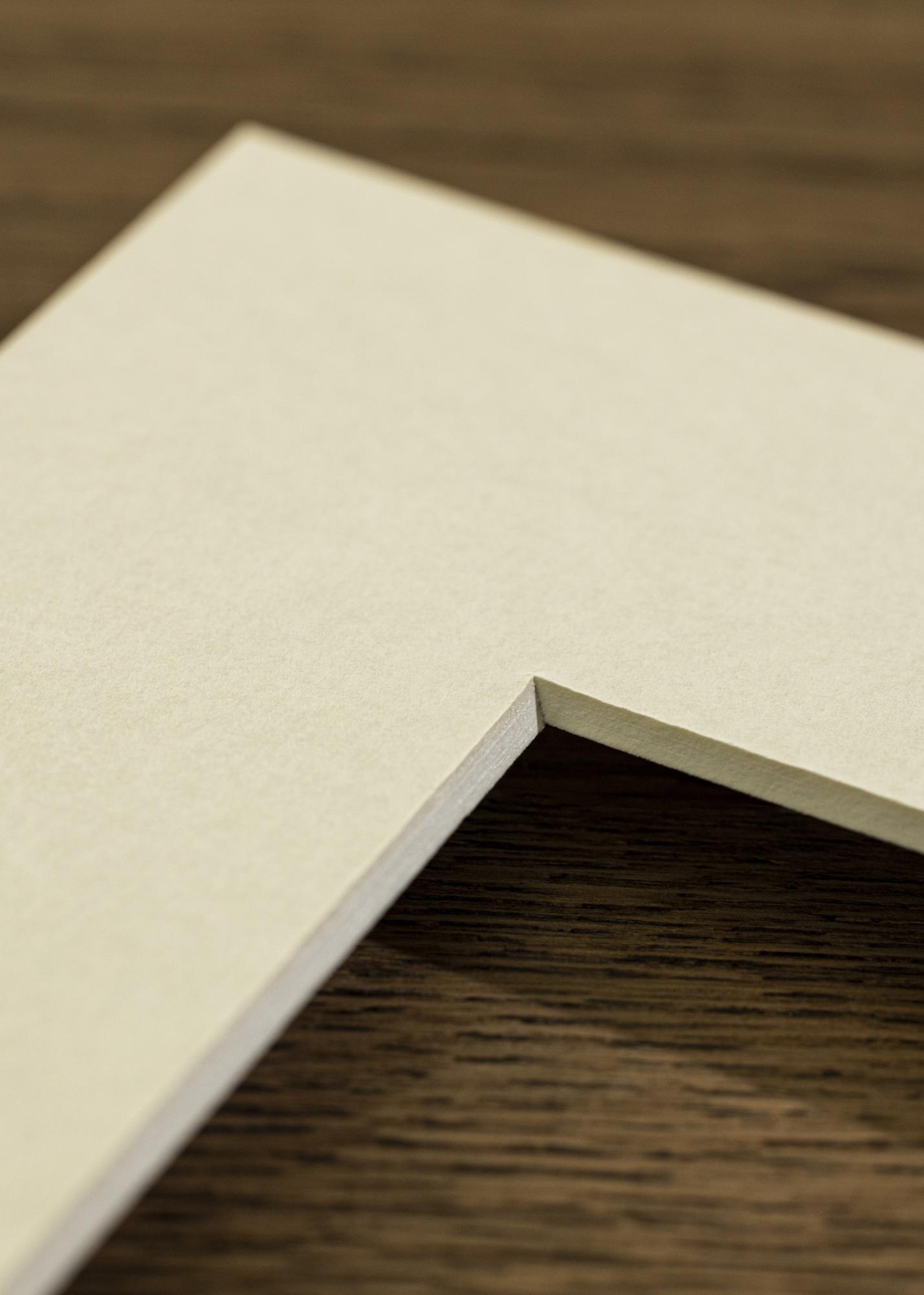 Ein cremefarbener Passe-Partout ist weiß mit einer cremefarbenen Nuance. Da es nicht so stark weiß ist wie ein normaler weißer Passe-Partout, macht es einen weicheren Eindruck. Von unseren weißen Passe-Partouts ist dieser die Nummer 3 in unserer Farbpalette. Das weißeste ist Kreideweiß, gefolgt von Standard-Standardweiß, dann dieses.