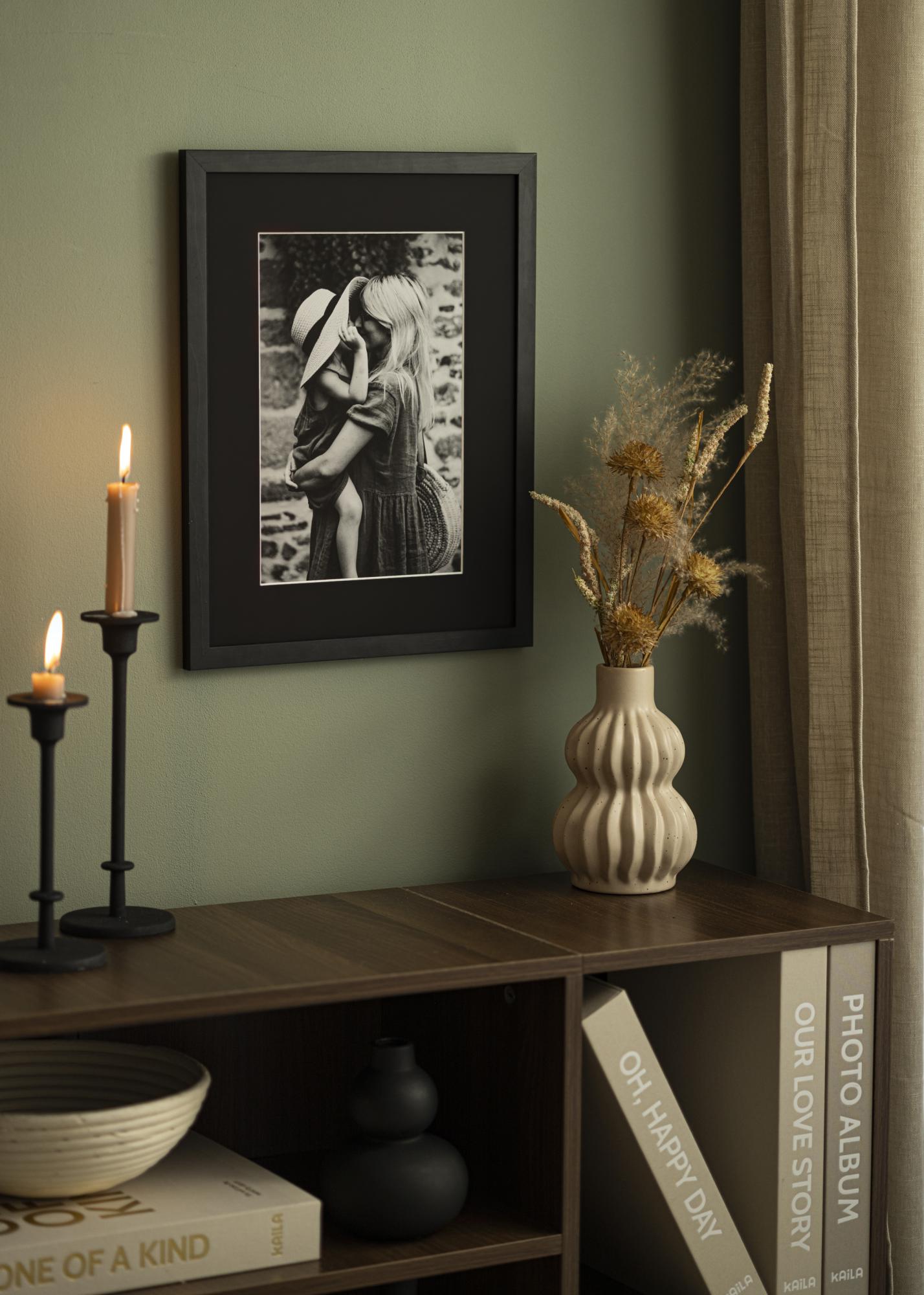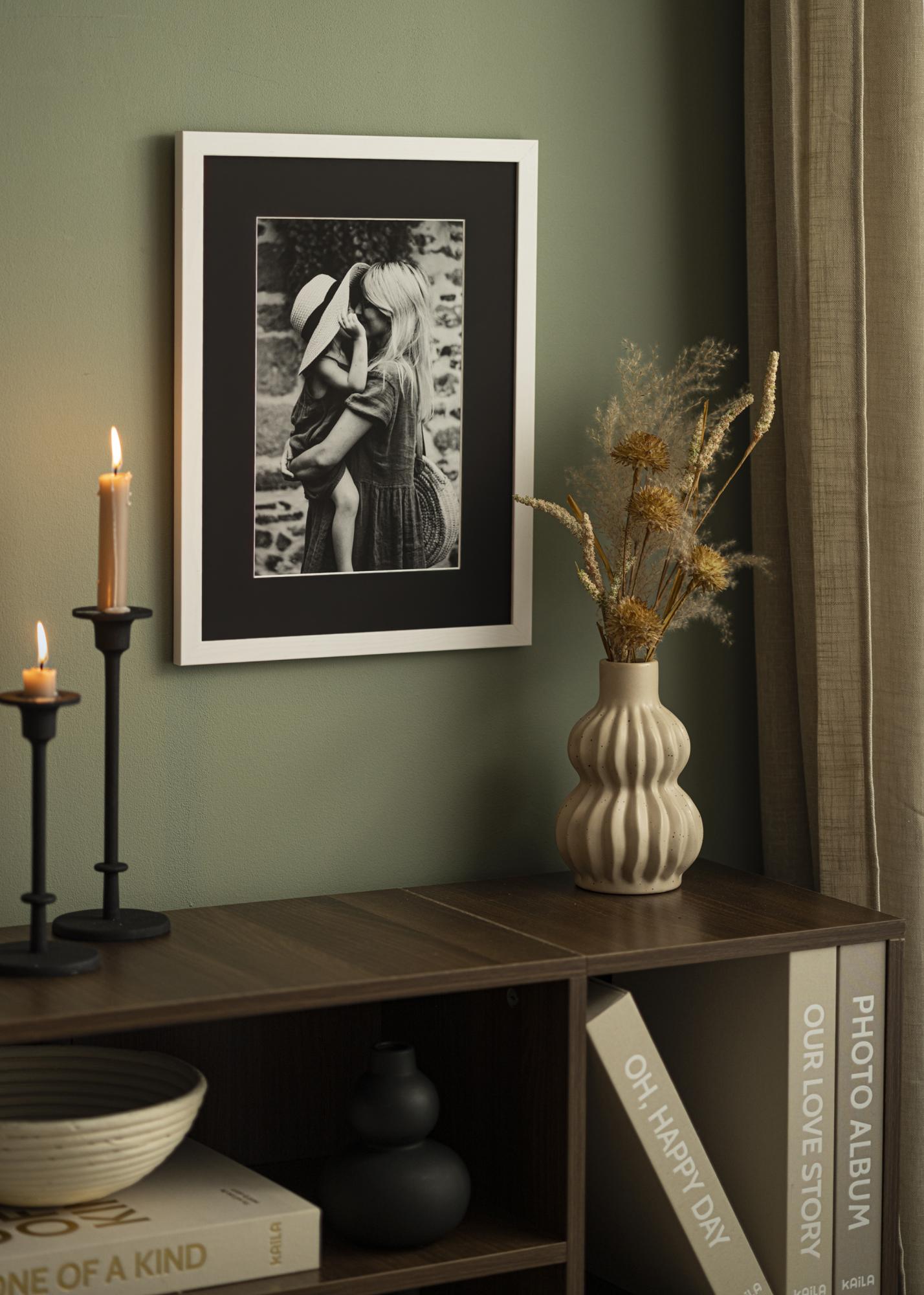 Der schräg geschnittene Innenrand mit einem weißen Kern erzeugt einen subtilen Kontrasteffekt, der eine elegante und tiefe Rahmung bietet. Die matte schwarze Oberfläche verstärkt den Ausdruck des Motivs und passt sowohl zu modernen als auch klassischen Rahmungen. Ob Sie ein Familienporträt oder ein Kunstwerk hervorheben möchten, dieses Passepartout wird Ihrem Motiv die Aufmerksamkeit schenken, die es verdient.