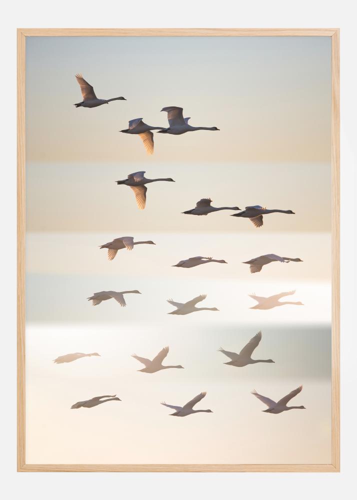 Ein Poster aus der Tierwelt mit einem Schwarm Gänse, die bei Sonnenuntergang hoch fliegen. Diese malerische Aufnahme erzählt eine Geschichte über die Migration, und das alles vor dem Hintergrund wunderschöner Blau- und Orangetöne. Reisen Sie mit, wenn Sie dieses Poster zu Hause aufhängen.