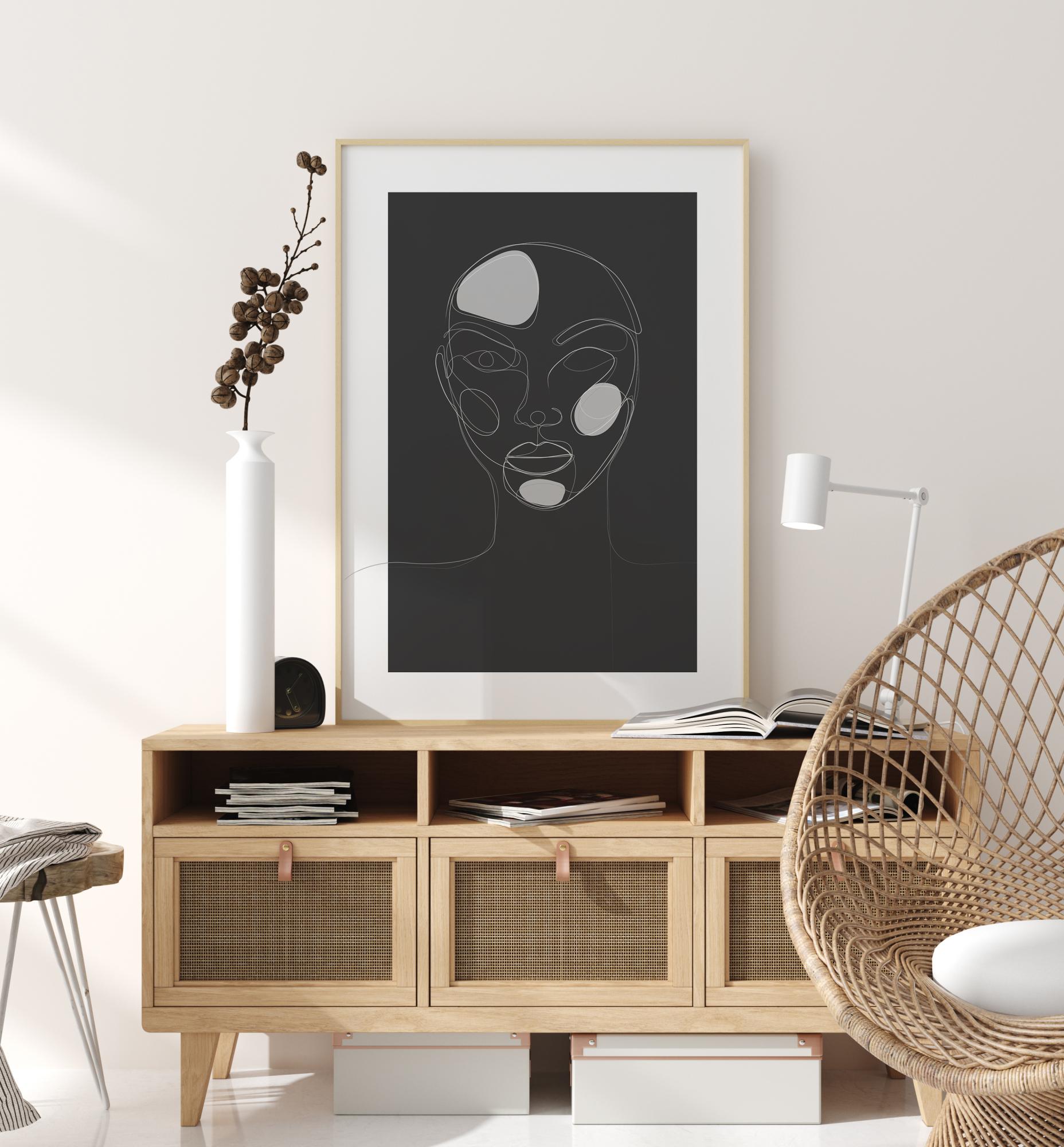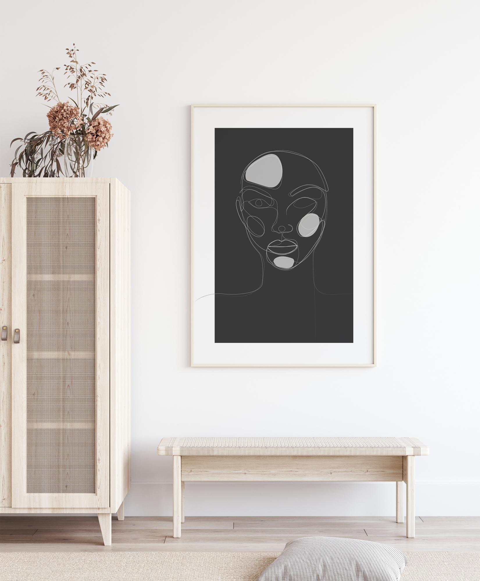 Ein atemberaubendes Bild von Kopf und Schultern einer Frau auf einem schwarzen Hintergrund. Drei weiße Flecken heben die Stirn, die Wange und das Kinn der Frau hervor. Der Druck ist eine einzeilige Zeichnung, bei der alle Merkmale weiß umrandet sind. Ein aussagekräftiger Druck, der in Ihrem Zuhause hängen sollte.
