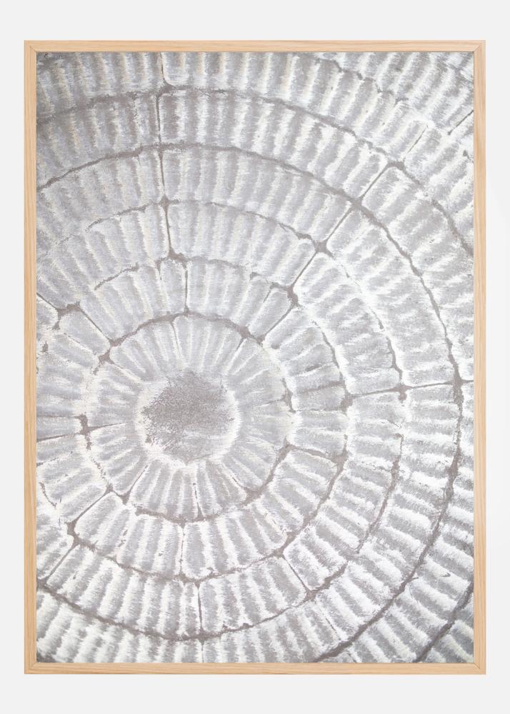 Ein glasiges Bild einer grauen Musterplatte. Die kreisförmigen beigen und weißen Ringe verleihen dem Teller ein geripptes Aussehen und bilden einen perfekten glatten Kreis in der Mitte. Mit seinen sanften, beruhigenden Farben wirkt dieser reizvolle Druck geheimnisvoll und friedlich. Ideal für eine bunte Wand.