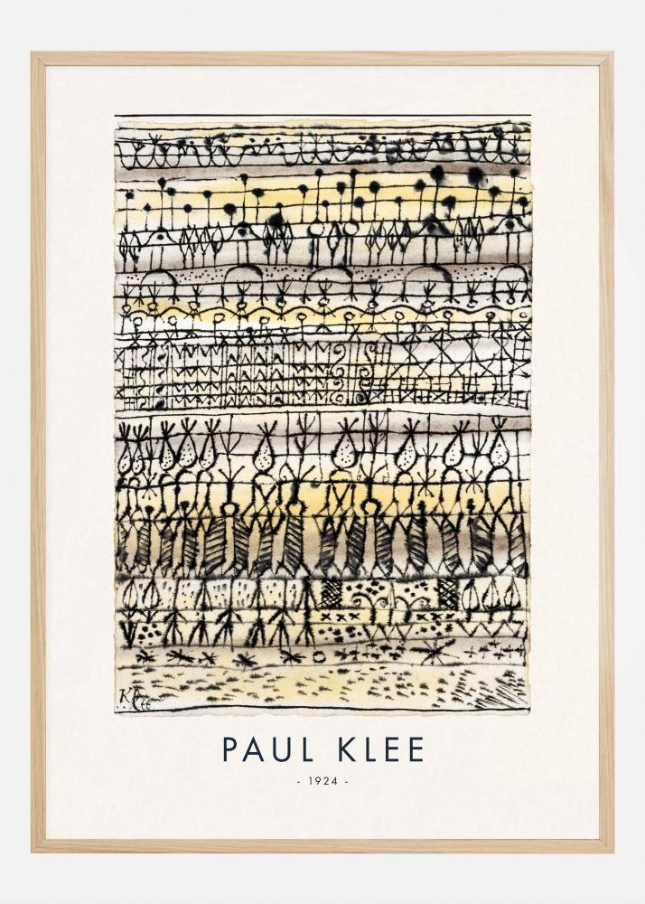 Dieses Poster zeigt Paul Klees Werk "Cooling in a Garden of the Hot Zone" von 1924, ein komplexes Muster aus Linien und Formen, das an einen Garten in einer abstrakten Landschaft erinnert. Auf spielerische Weise erforscht Klee Themen der Natur und Struktur, indem er Schichten von symbolischen und geometrischen Elementen übereinander stapelt und so eine rhythmische und fast musikalische Komposition schafft. Die vielfältige Verwendung von Linientypen und kontrastierenden Farben erweckt den abstrakten Garten auf eine Weise zum Leben, die typisch für Klees Kunst ist.