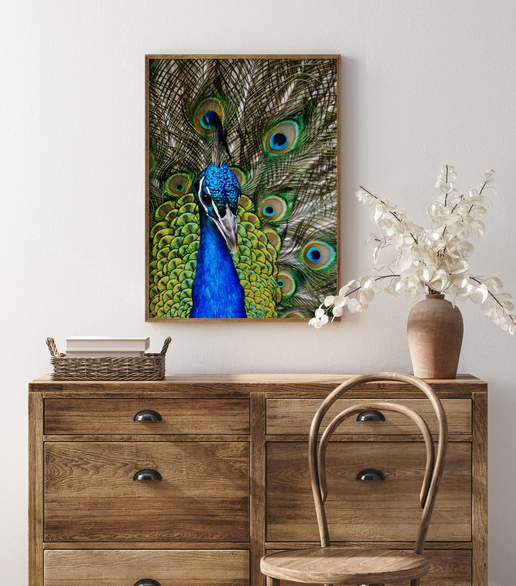 Ein atemberaubender Druck eines Pfaus in Nahaufnahme. Mit seinen großen, farbenfrohen Schwanzfedern mit augenähnlichen Mustern leuchtet dieses extravagante Geschöpf im natürlichen Sonnenlicht. Holen Sie sich die Schönheit dieses Vogels in Ihr Zuhause. Ein perfekter Druck, um jede kahle Wand zu verschönern.
