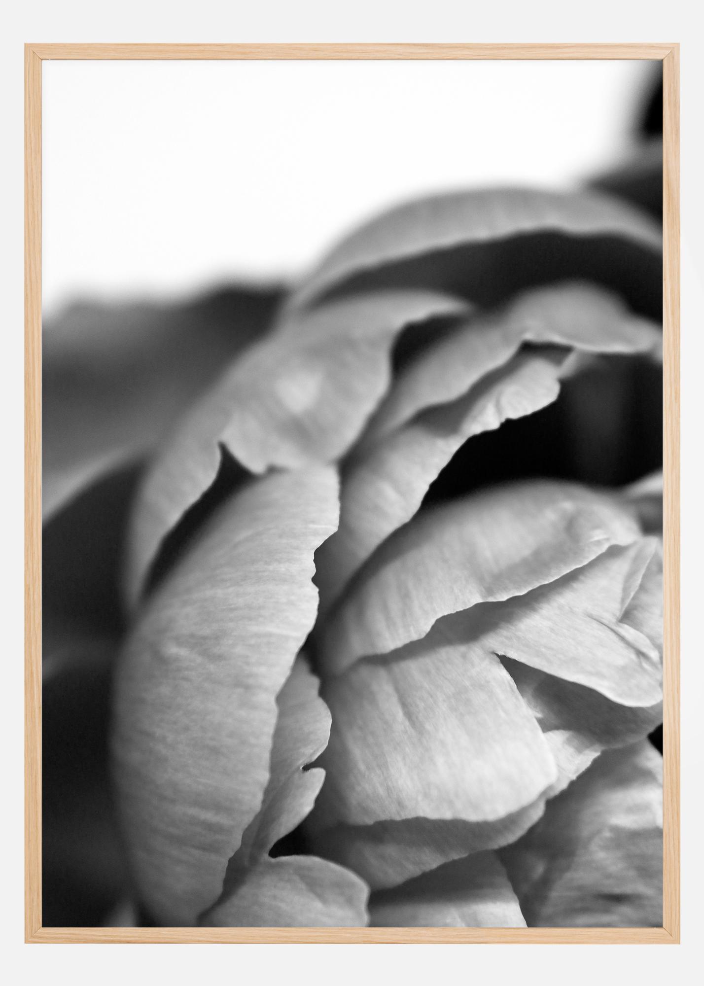 Eine schwarz-weiße Nahaufnahme einer Pfingstrose. Ihre weißen Blütenblätter wölben sich anmutig übereinander und bilden eine kohlartige Struktur. Vor einem unscharfen Hintergrund können Sie die perfekt geformten Blätter dieser zarten Blume bewundern. Ein perfekter Druck für jeden, der Blumen liebt.