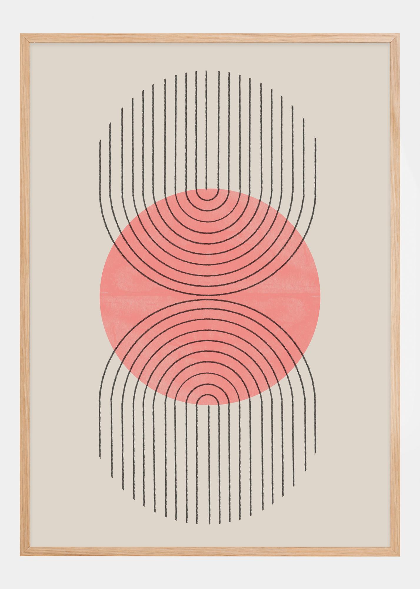Dieses zeitgenössische Poster kombiniert die Einfachheit geometrischer Form mit einem sanften, ansprechenden pfirsichfarbenen Ton. Ein zentraler Kreis mit konzentrischen Ringen, der an eine ruhige Wasseroberfläche erinnert, ist von einem Feld vertikaler schwarzer Linien umgeben, die scheinbar nach außen pulsieren. Dieser Kontrast zwischen der runden Form und den geraden Linien schafft eine interessante Dynamik und ein Gefühl von Bewegung im Kunstwerk.