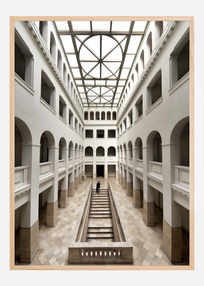 Ein prächtiges Bild des Gebäudes von Peter Behrens. Die beige-weiße Inneneinrichtung fängt eine Figur ein, die die Treppe hinaufgeht. Die transparente Überdachung beleuchtet das architektonische Werk mit kreisförmigen und quadratischen Fenstern, die das Licht durchscheinen lassen. Schaffen Sie eine stilvolle Atmosphäre mit diesem atemberaubenden Druck.