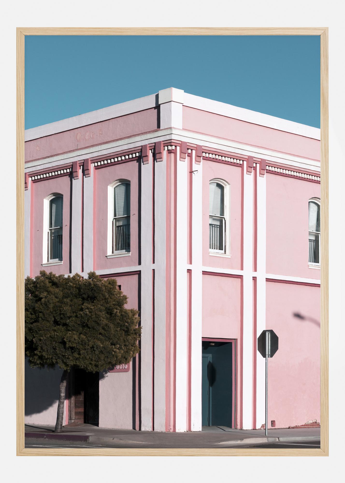 Ein wunderschönes Bild eines zweistöckigen rosafarbenen Gebäudes unter einem strahlend blauen Himmel. Dank seiner kräftigen, leuchtenden Farben erweckt es ein ruhiges, beruhigendes Gefühl. Links vom Gebäude steht ein kleiner buschiger Baum, der fast den Eingang zum Gebäude versperrt. Bringen Sie einen Hauch von Farbe in Ihr Zuhause mit diesem entzückenden Druck.