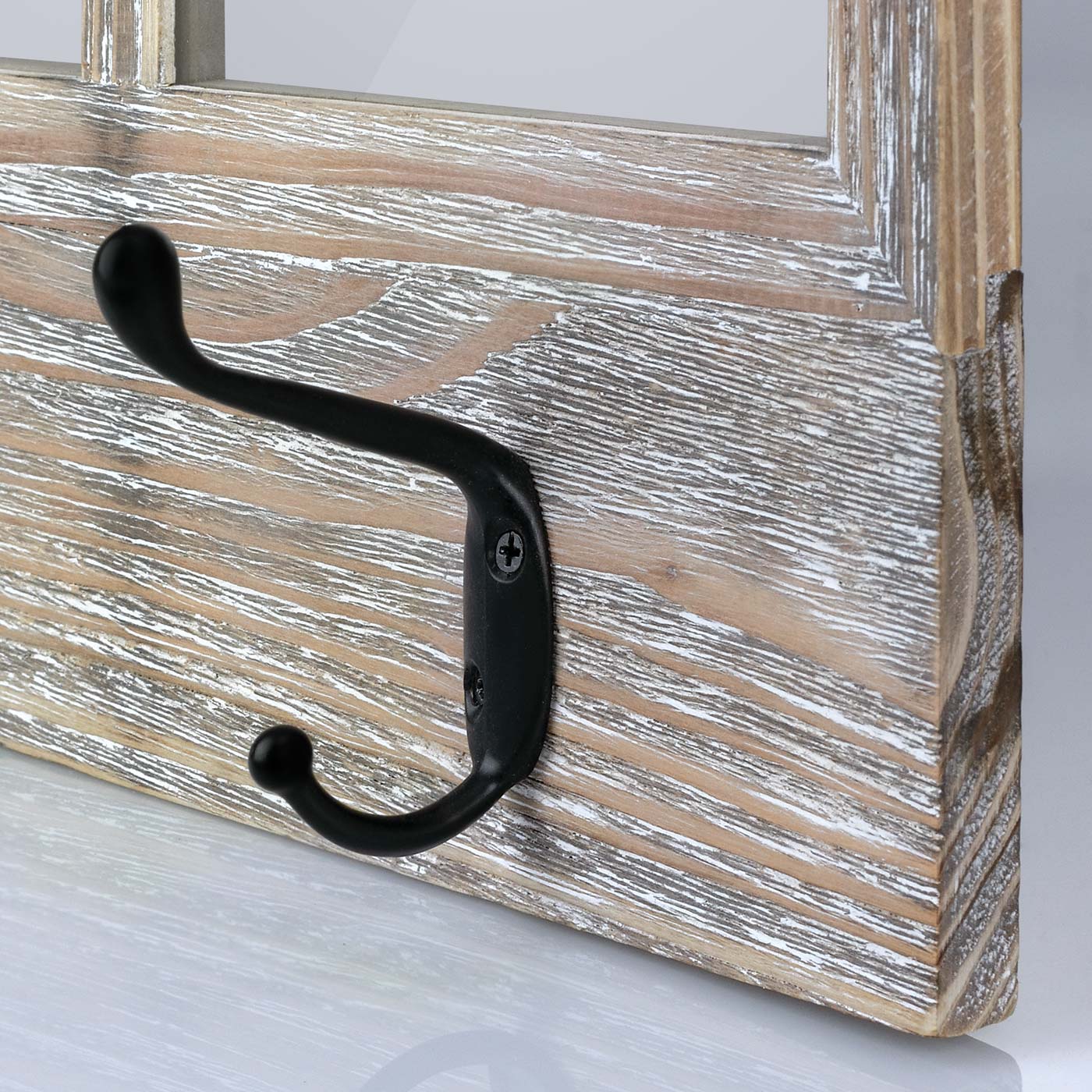 Schöner Collage-Bilderrahmen aus Holz, der 3 Bilder im Format 10x15 cm gekonnt in Szene setzt. Am unteren Teil des Collagerahmens befinden sich 3 dekorative Haken. Hier können z.B. hübsche Accessoires als zusätzliche Wanddekoration aufgehängt werden. Der Collagerahmen ist aus Holz gefertigt. Die weißgesprenkelten Einschläge verleihen dem Collagerahmen einen charmanten ländlich-rustikalen Touch. Der Bilderrahmen ist mit einer Wandhalterung ausgestattet.