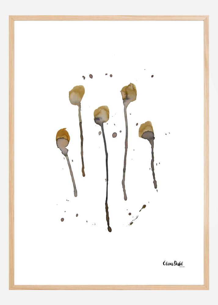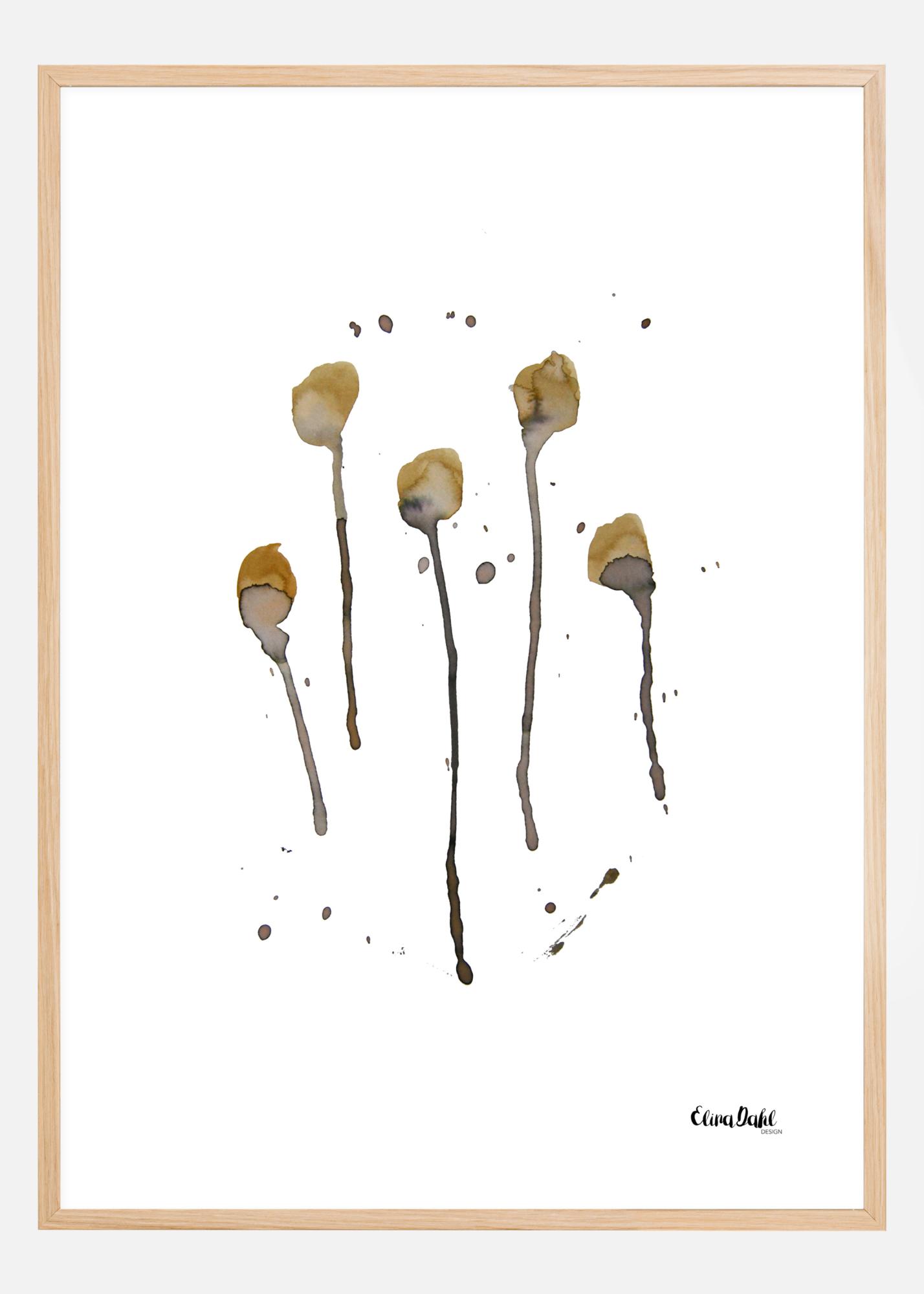Ein botanischer Druck mit fünf kleinen Blumenstängeln. Die fünf braunen und grauen Blumenstängel stehen in der Mitte des Drucks auf einem weißen Hintergrund. Braune Farbspritzer umgeben die Stängel unregelmäßig. Ein entzückendes Bild für jeden, der Pflanzen liebt.