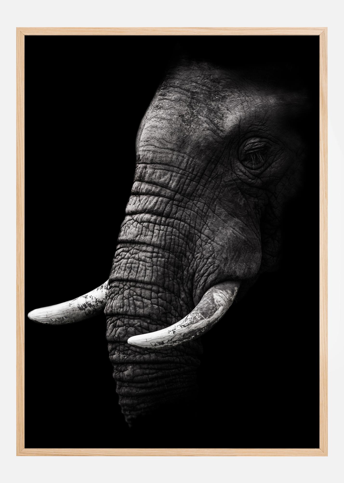 Ein atemberaubender Schwarz-Weiß-Druck eines Elefantenkopfes. Der schwarze Hintergrund hebt die kleinen Elefantenstoßzähne hervor. Mit seinem kleinen faltigen Rüssel und den geschlossenen Augen ist das Bild eine reine Darstellung der Schönheit des Elefanten. Ein idealer Druck für Tierliebhaber.