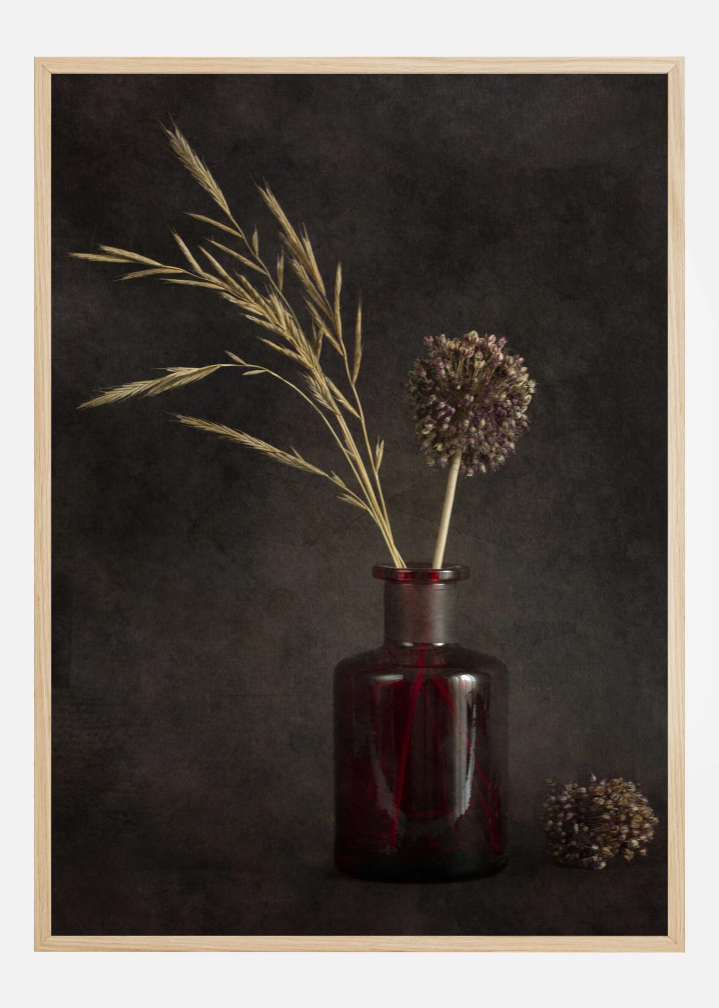 Ein schönes, aber einfaches Bild von zwei getrockneten Gräsern in einem Glas. Auf einem dunkelbraunen Hintergrund sind die gelben Gräser in einem roten Glas positioniert. Rechts vom Glas liegt ein getrocknetes Gras neben dem Glas. Ein schöner Druck, der einer weißen Wand etwas Farbe verleiht.