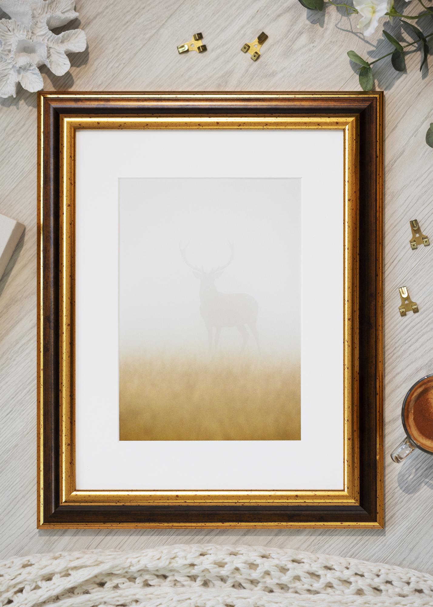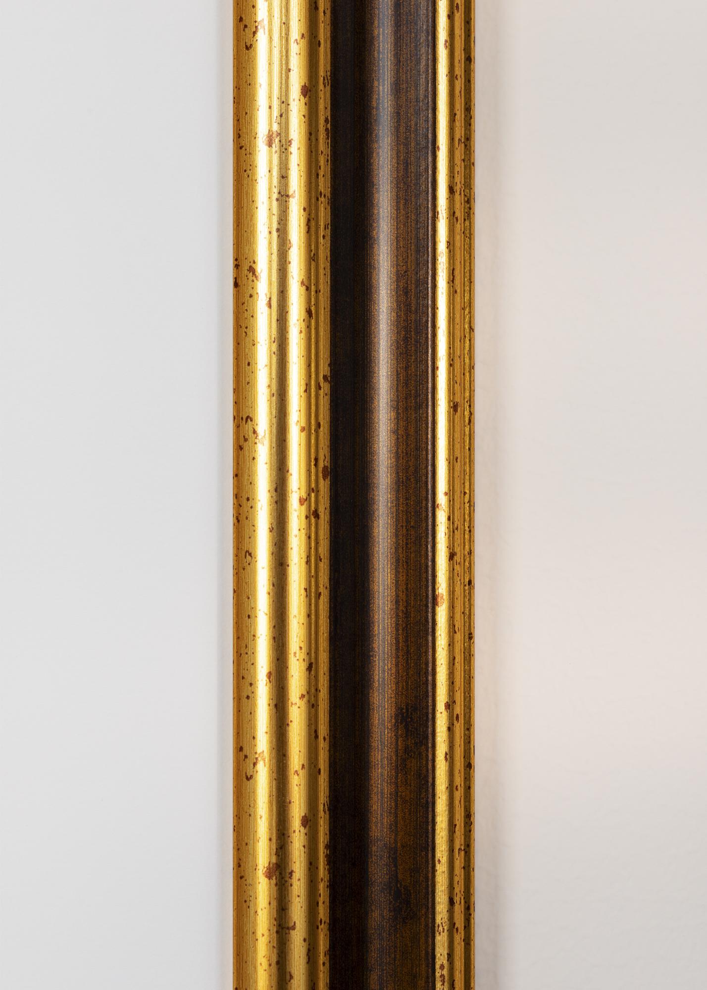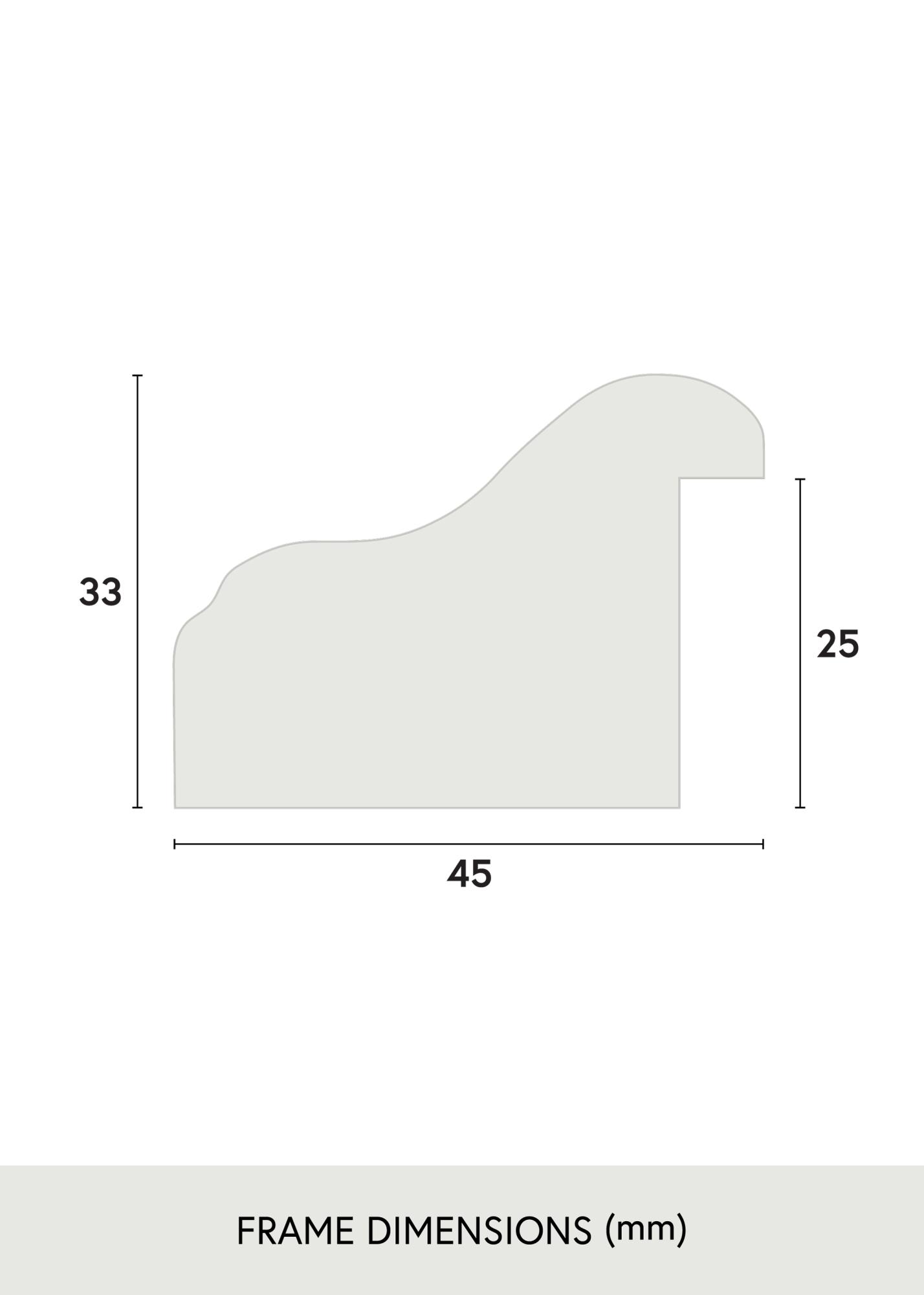 Der Rahmen besteht aus Verbundmaterial, was ihm sowohl Stabilität als auch Leichtigkeit verleiht. Mit einer Tiefe von 33 mm bietet dieser Rahmen ein robustes Gefühl und behält dennoch ein elegantes Profil. Die glatte Oberfläche und der goldene Ton sorgen für einen zeitlosen Ausdruck – perfekt für traditionelle, schlichte oder auch aufwendigere Einrichtungsstile.