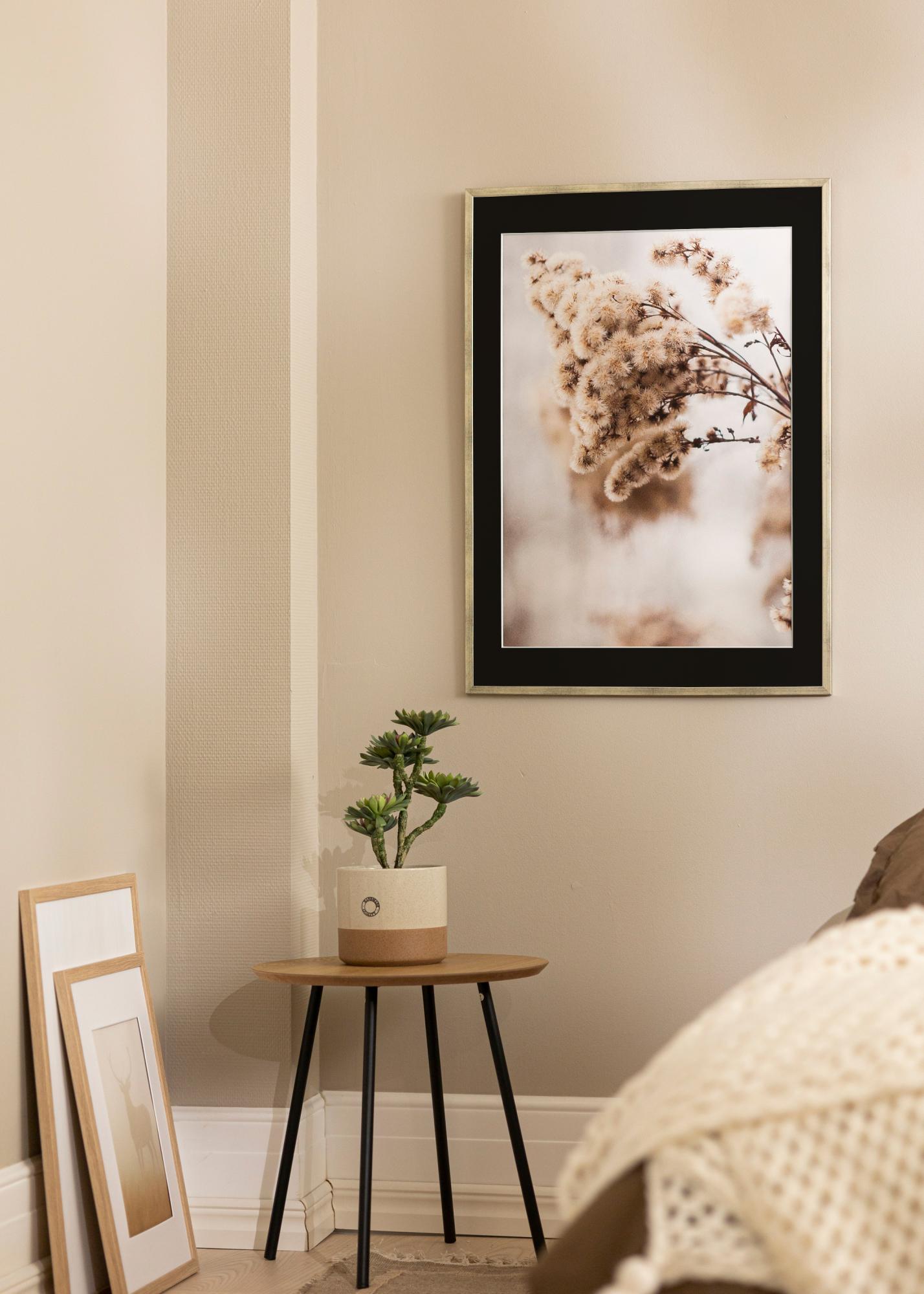 Set mit Bilderrahmen und passendem, schwarzem Passepartout. Das Produktbild zeigt die Maße des Rahmens (fettgedruckt) und die Innenmaße des Passepartouts (in Klammern). Bitte beachten, dass die Innenmaße des Passepartouts immer 1 cm kleiner sein müssen als die gewünschte Bildgröße.