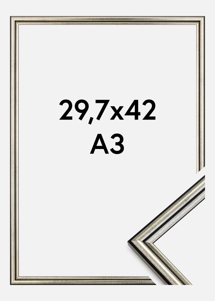Entdecken Sie die Eleganz und das moderne Design mit unserem 29,7x42 cm (A3) Silberrahmen, perfekt geeignet um Ihre Lieblingskunstwerke oder Fotos hervorzuheben. Dieser Bilderrahmen ist eine stilvolle Kombination aus silbernen Nuancen, dezenten schwarzen Akzenten und schwarzen Linien, die einen anspruchsvollen Eindruck hinterlassen.