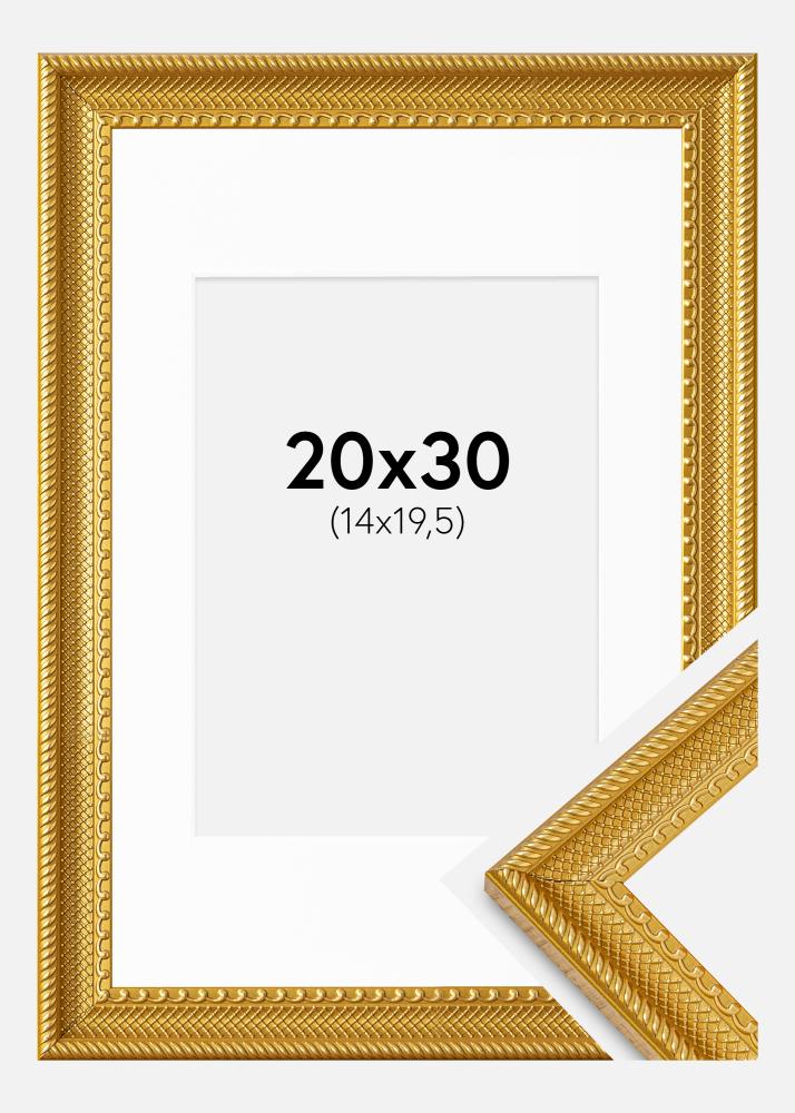 Verwandeln Sie Ihre Bilder in Kunstwerke mit unserem eleganten, goldfarbenen Rahmen, komplett mit einem stilvollen weißen Passepartout. Dieser Rahmen ist so gestaltet, dass er Bilder in der Größe 15x21 cm (A5) passt und hat eine Gesamtaußenmaß von 24x34 cm. Mit einer Breite von 26 mm und einer Tiefe von 19 mm bietet der Rahmen eine robuste und raffinierte Einrahmung, die Ihre Lieblingsbilder hervorhebt.
