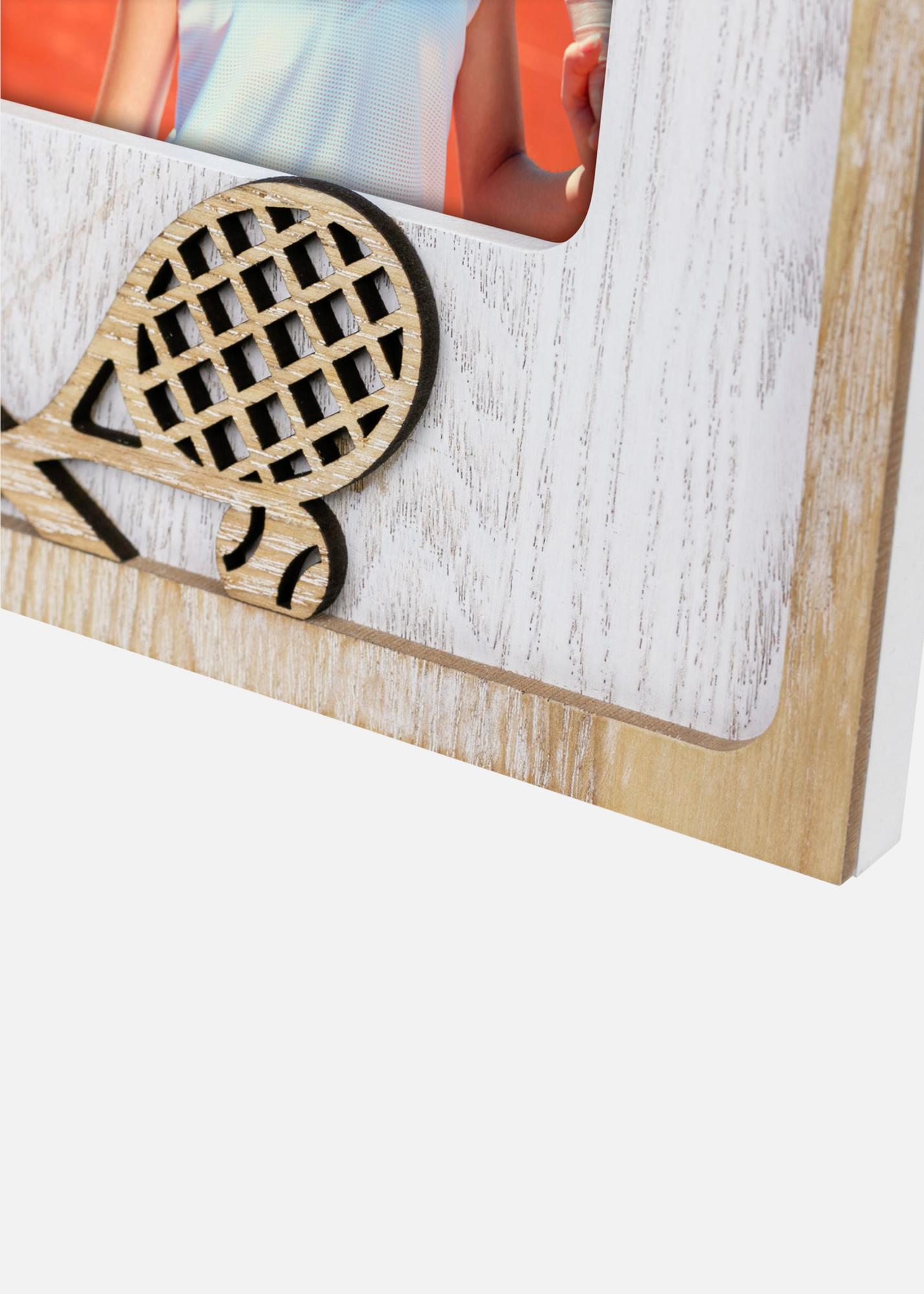 Ein sportlich inspiriertes Fotorahmen mit Tennisthema. Dekoriert mit ausgeschnittenen Tennisschlägern, perfekt zum Einrahmen von Erinnerungen vom Tennisplatz oder Sportaktivitäten. Passend für Bildgröße 10x15 cm.