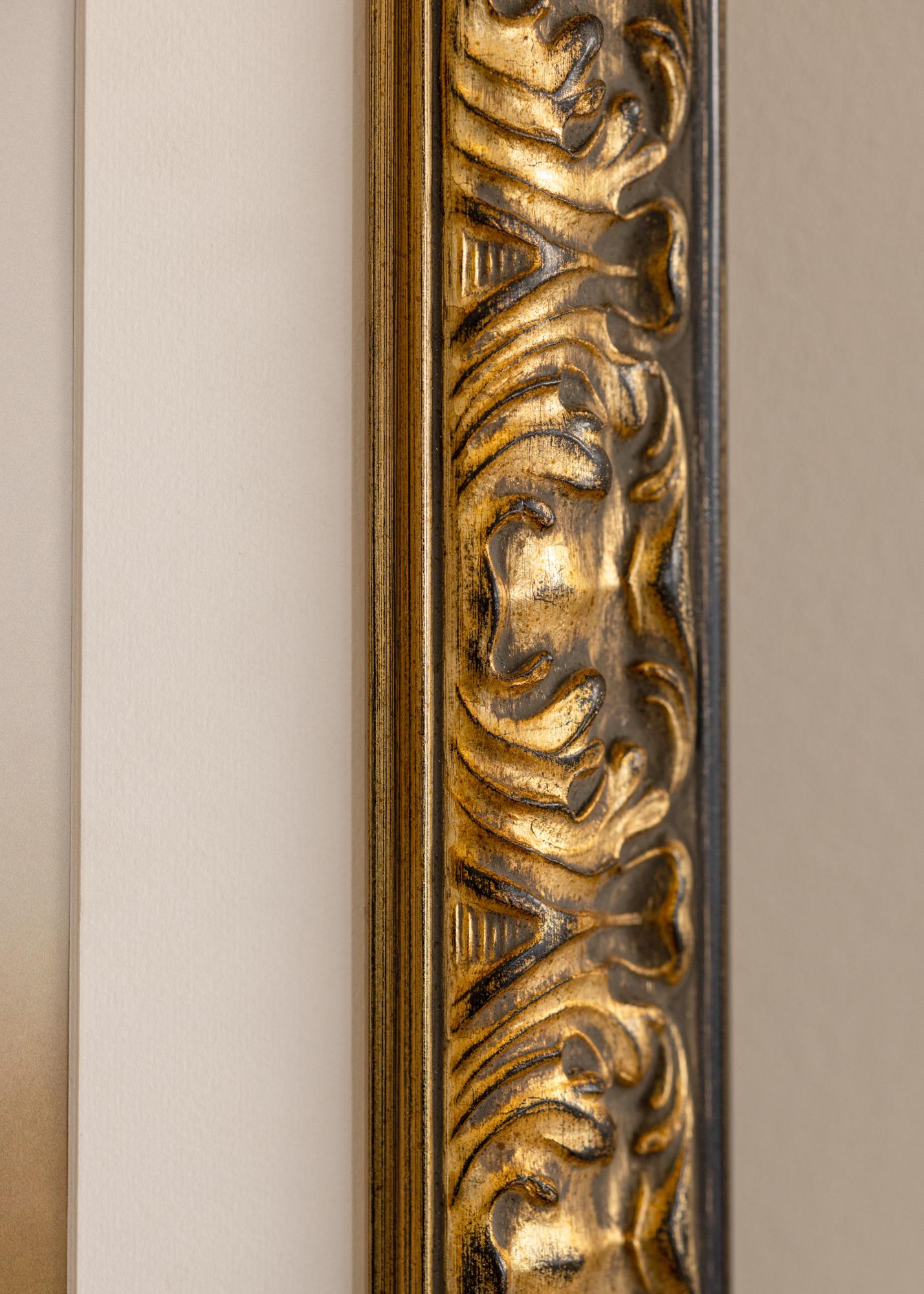 Unser maßgefertigter Bilderrahmen Odin in Gold und Schwarz ist die perfekte Wahl für diejenigen, die eine elegante und klassische Einrahmung suchen. Mit seiner Goldoberfläche und schwarzen Akzenten bietet dieser Fotorahmen ein antikes Gefühl, das jedes Kunstwerk oder Foto aufwertet. Das verzierte Design schafft einen schönen Kontrast zwischen dem warmen Gold und den tiefschwarzen Details, was einen stilvollen und traditionellen Look verleiht.
