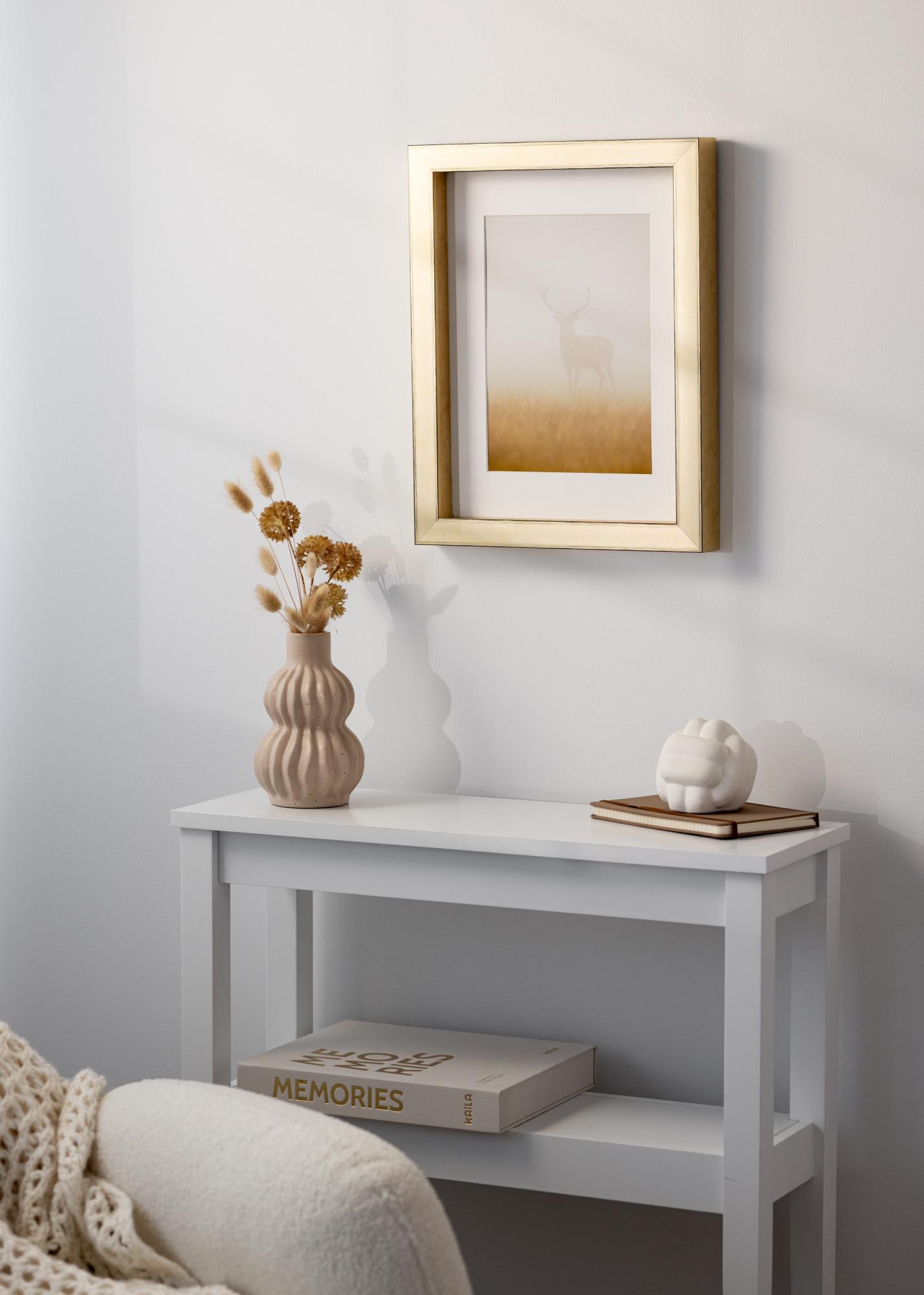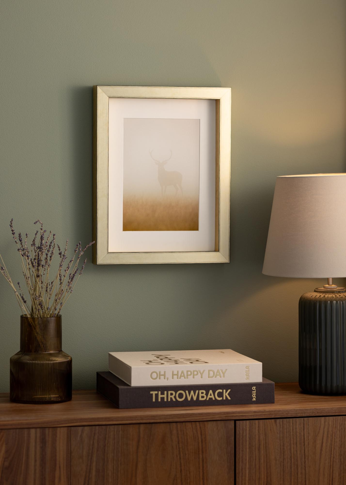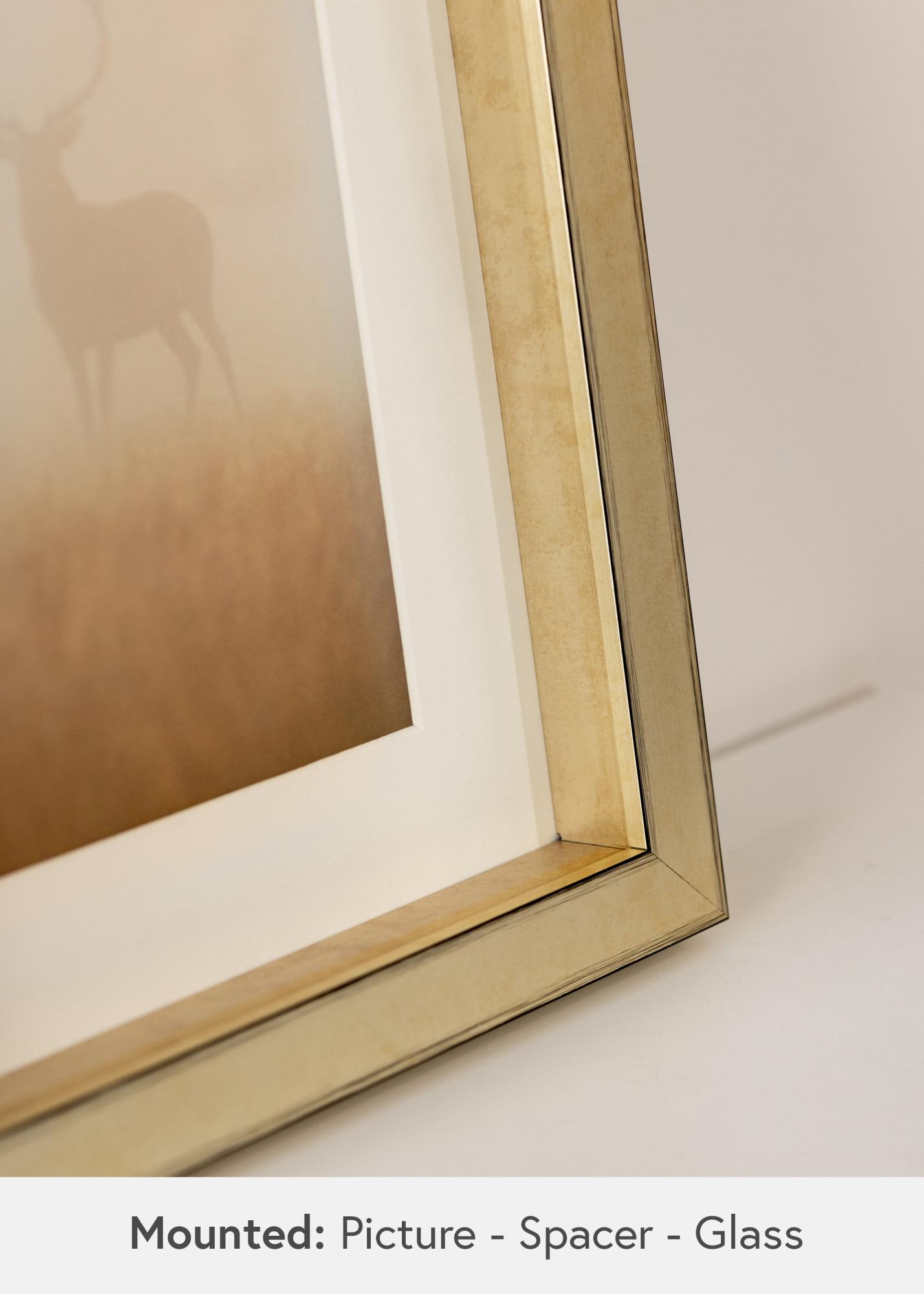 Mit dem Rahmen Tyr Gold haben Sie die Möglichkeit, zu bestimmen, wie Sie Ihr Motiv präsentieren möchten. Sie können es im hinteren Teil des Rahmens platzieren, um einen schwebenden Eindruck zu erzeugen, oder näher an der Vorderseite für eine traditionellere Einrahmung. Diese Flexibilität erleichtert es, den Rahmen sowohl mit Ihrem Kunstwerk als auch mit Ihrem Einrichtungsstil abzustimmen.