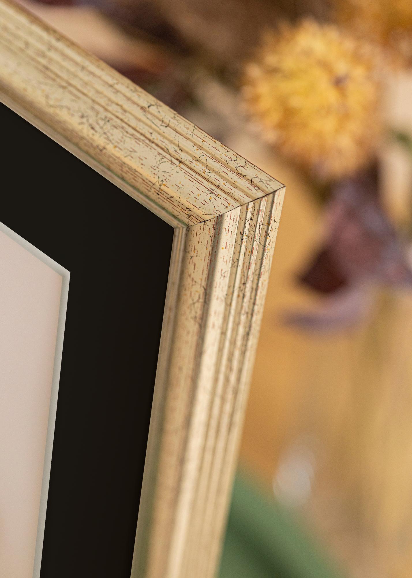 Set mit Bilderrahmen und passendem, schwarzem Passepartout. Das Produktbild zeigt die Maße des Rahmens (fettgedruckt) und die Innenmaße des Passepartouts (in Klammern). Bitte beachten, dass die Innenmaße des Passepartouts immer 1 cm kleiner sein müssen als die gewünschte Bildgröße.