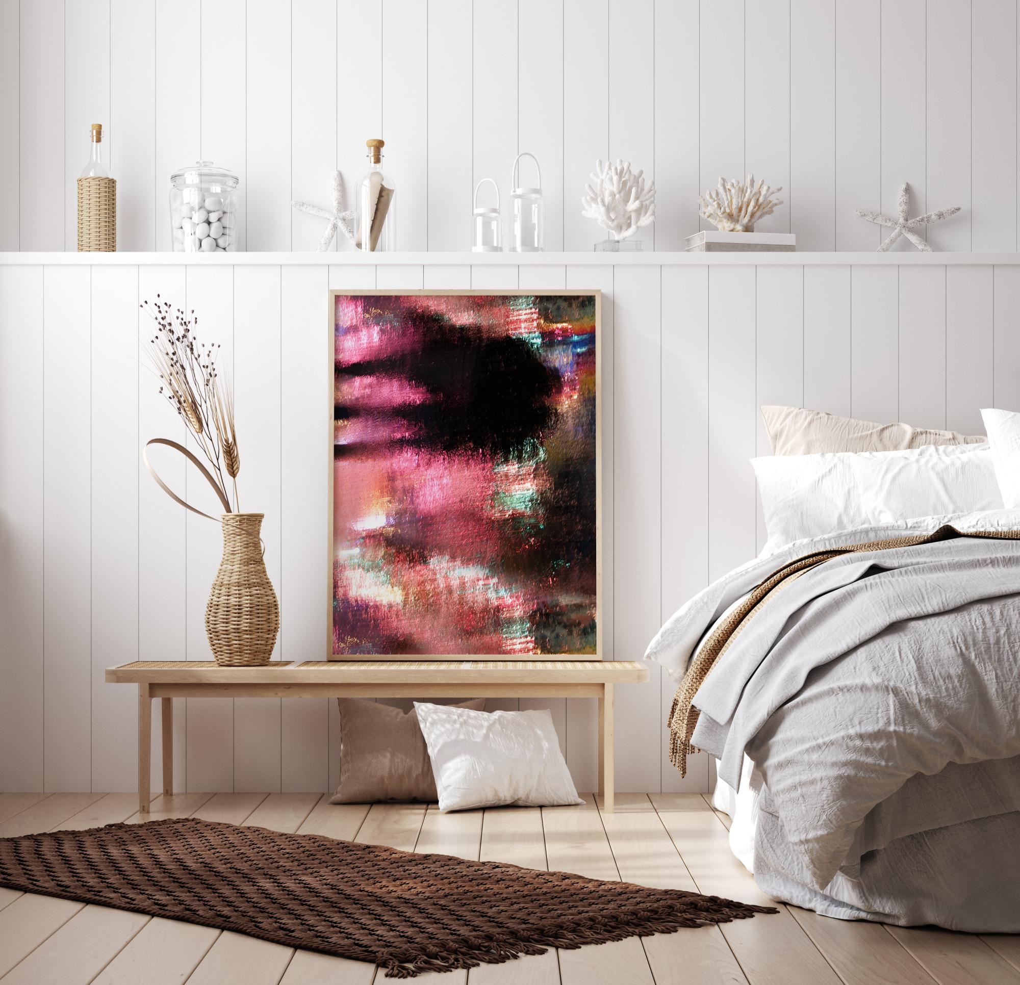Eine perfekte Farbmischung mit rosa Tönen dominiert diesen mehrfarbigen Druck. Oben auf dem Poster befindet sich eine schwarze Fläche, die ein Gefühl von Tiefe vermittelt. Rechts von der schwarzen Fläche befindet sich eine vertikale Röhrenform in Rot- und Grüntönen. Ein perfekter Druck, um einer schlichten Wand einen Hauch von Farbe zu verleihen.