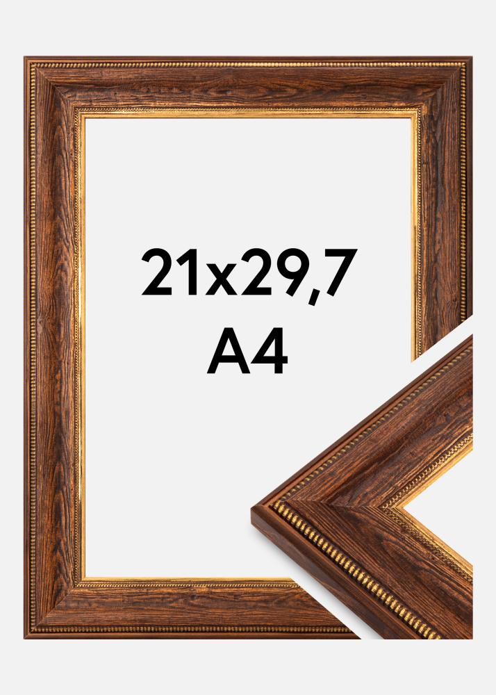 Dieser elegante Bilderrahmen in der Größe 21x29,7 cm ist eine perfekte Kombination aus rustikalem Charme und klassischer Eleganz. Hergestellt aus hochwertigem Holz, hat der Rahmen eine tiefbraune Farbe mit dekorativen Golddetails entlang der Innenkante. Die Holzstruktur ist deutlich sichtbar und verleiht ein warmes und natürliches Gefühl, während die goldfarbenen Einsätze einen raffinierten Touch hinzufügen, der hervorragend zu traditionellen und vintageinspirierten Einrichtungsstilen passt.