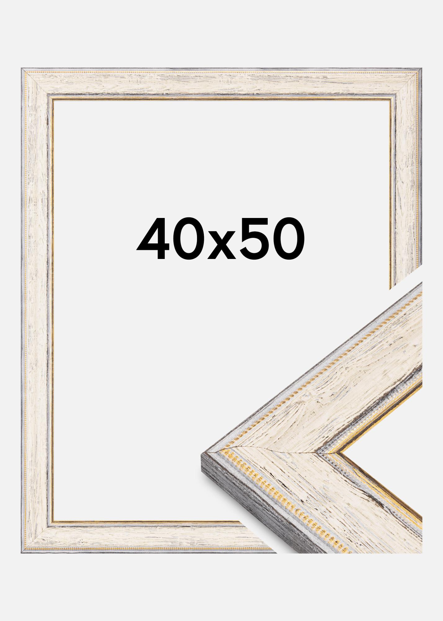 Dieser elegante Bilderrahmen ist eine perfekte Kombination aus Vintage-Inspiration und moderner Funktionalität. Mit einer Größe von 40x50 cm ist er ideal, um Ihre Lieblingsfotos oder Kunstwerke hervorzuheben. Der Rahmen ist aus Holz gefertigt und hat ein schönes, rustikales Weiß und Grau Finish, das ihm einen charmant gealterten Look verleiht. Die subtilen Golddetails entlang der Innenkante fügen eine klassische Note hinzu, die hervorragend zu sowohl ländlichen als auch shabby chic Einrichtungsstilen passt.