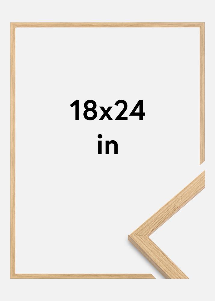 Schmaler Bilderrahmen in Eiche, der jedes Motiv gekonnt in Szene setzt. Die Rahmenleiste mit einer Tiefe von 13 mm und einer Breite von 13 mm ergibt ein hübsches, schlankes Design, das trotzdem gedigen und solide wirkt. Der Bilderrahmen ist aus Holz und echtem Bilderrahmenglas gefertigt. Auf der Rückwand befinden sich Wandhalterungen für die Aufhängung im Quer- als auch im Hochformat. Dieser Holz-Bilderrahmen ist in mehreren Größen erhältlich. Abgebildet ist der Rahmen in der Größe 18x24 inches (45,72x60,96 cm).