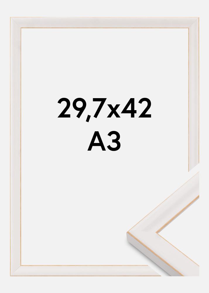 Der Rahmen ist aus Holz gefertigt und hat eine 20 mm breite Rahmenleiste sowie eine Tiefe von 16 mm. Das feine Golddetail entlang der Innenkante rahmt das Bild mit einem exklusiven Gefühl ein. Mit seiner Größe von 29,7 x 42 cm passt er perfekt für Motive im A3-Format. Dieser Bilderrahmen ist mit Metallhängern auf der Rückseite ausgestattet, was das Aufhängen sowohl horizontal als auch vertikal je nach Bedarf erleichtert.
