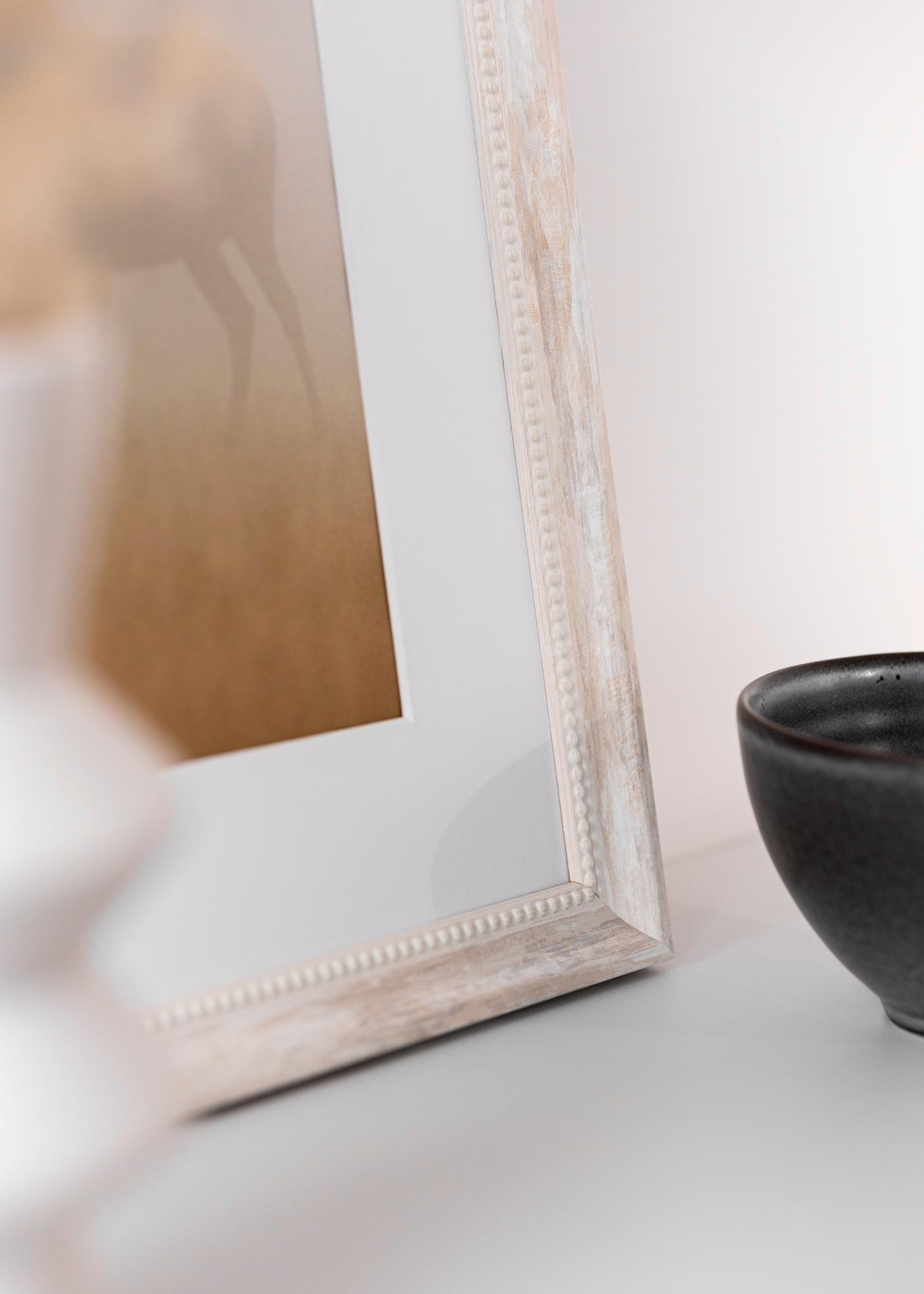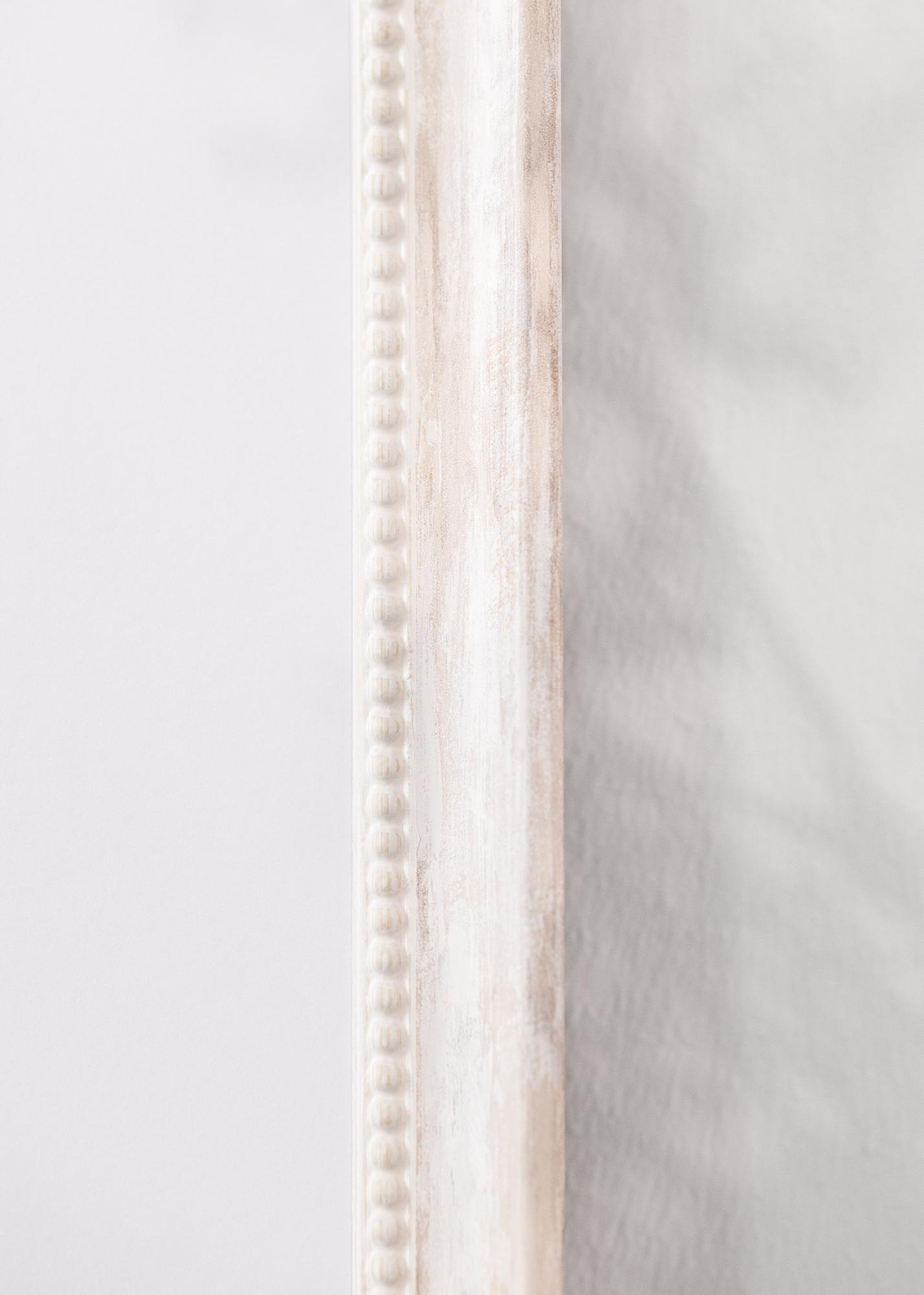Diesen wunderschönen Bilderrahmen in der Größe 59,4x84,1 cm ist eine perfekte Kombination aus rustikalem Charme und stilvoller Eleganz. Mit seiner weißen Farbe und der dekorativen Perlrand entlang der Innenseite bietet er eine subtile antike Note, die sowohl Kunstwerke als auch Fotografien aufwertet. Dieser Bilderrahmen ist aus Holz gefertigt und hat eine 25 mm breite Leiste sowie eine Tiefe von 19 mm, was ihm ein robustes und solides Gefühl verleiht.