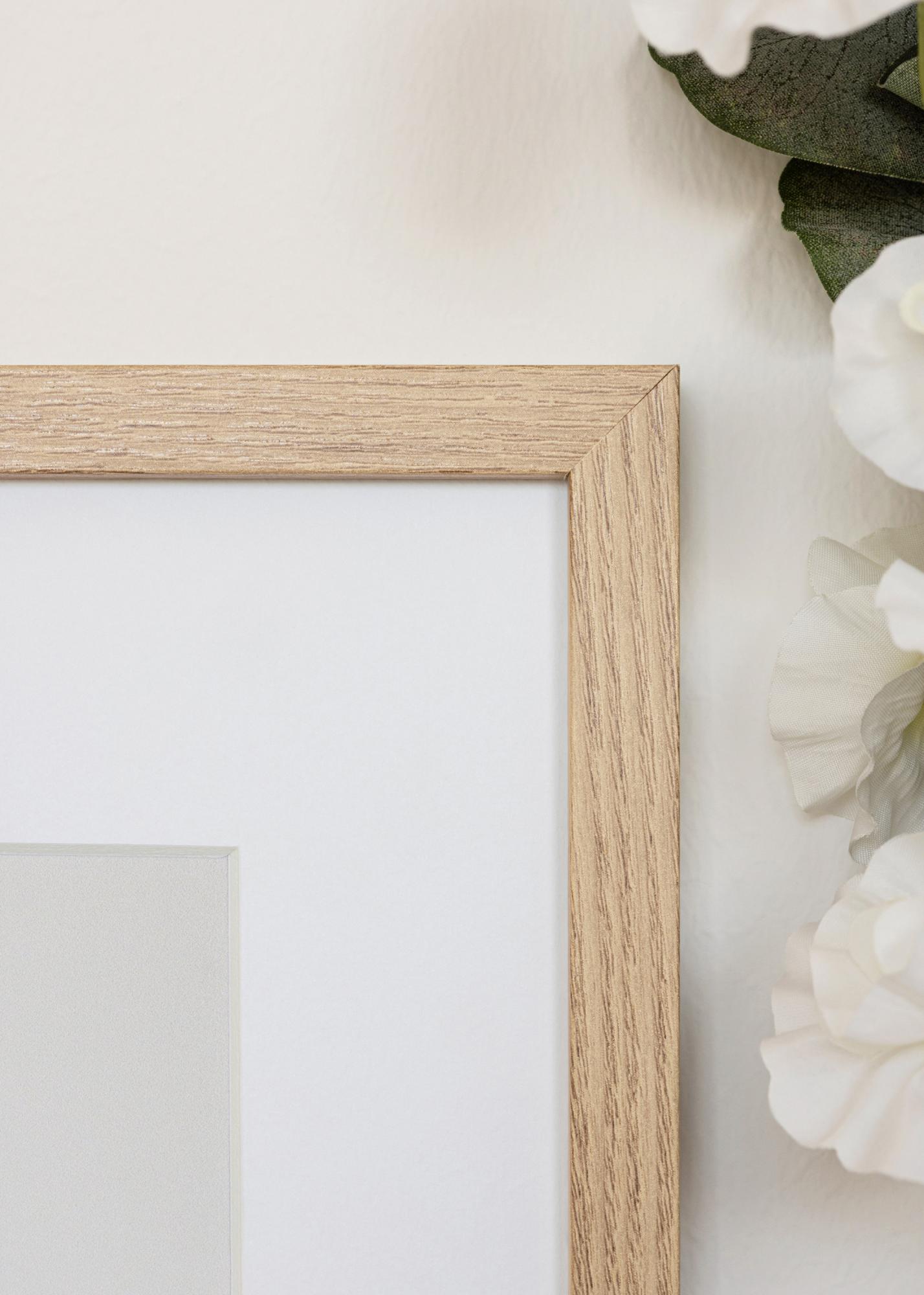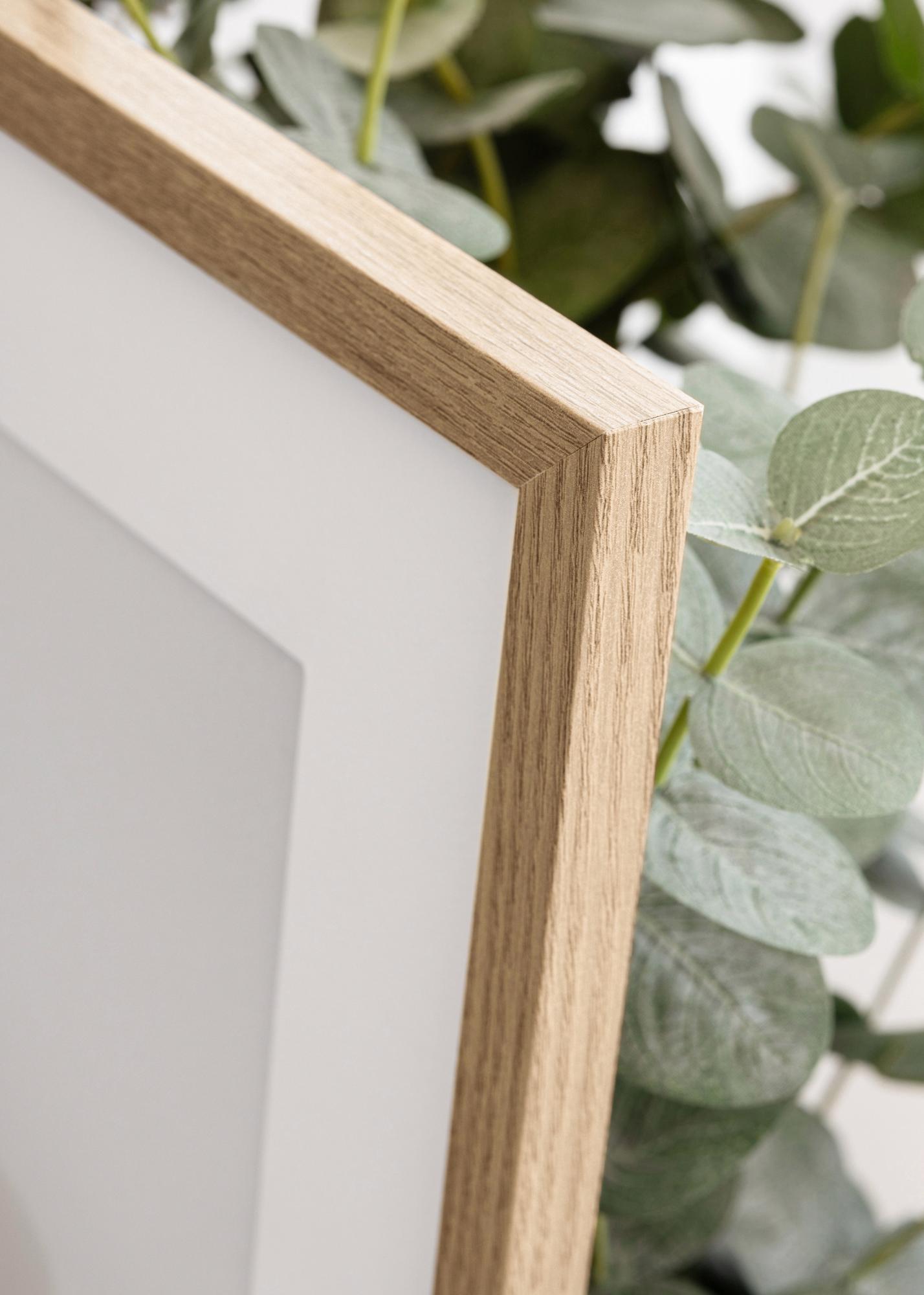Der Bilderrahmen ist aus MDF gefertigt, zeichnet sich durch das folierte Finish in Eiche-Optik sowie das schmale, 14 mm breite Rahmenprofil aus. Der Bilderrahmen bietet außerdem genug Raum, um das Bild mit einem stilvollen Passepartout zu komplettieren. Die Innentiefe (Falztiefe) des Rahmens beträgt 12 mm.