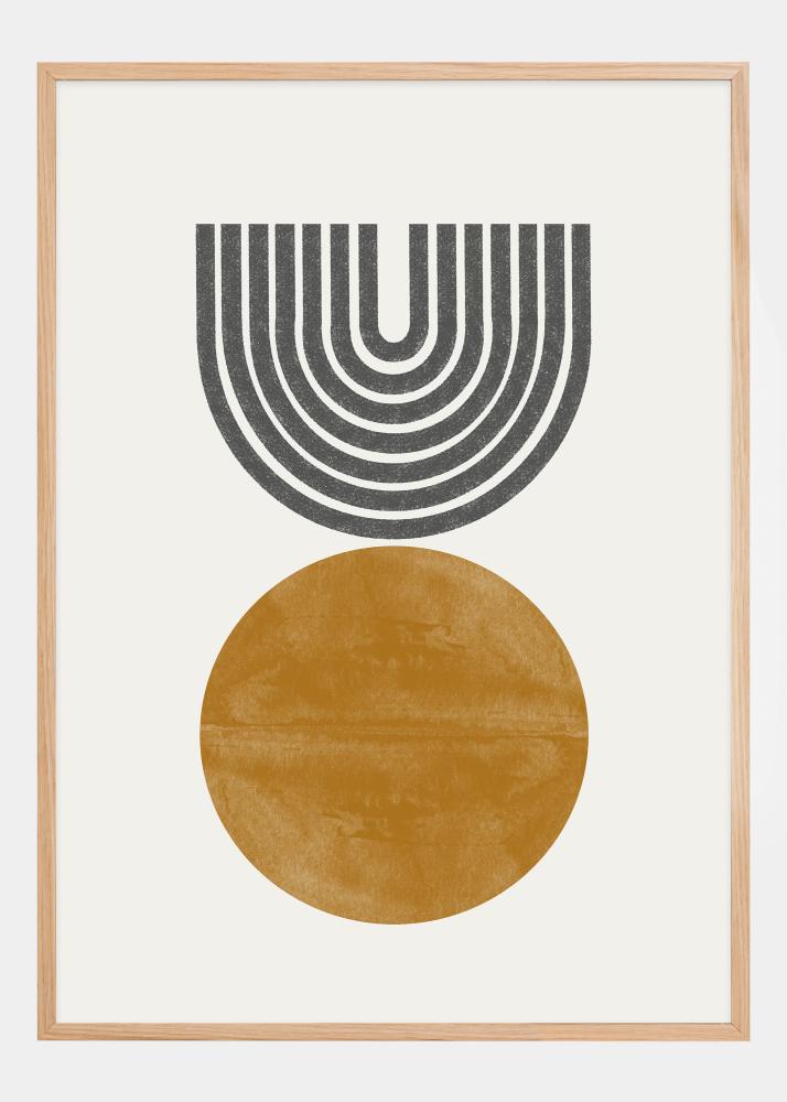 Dieses retro-inspirierte Poster kombiniert geometrische Präzision mit organischen Kurven, schafft ein Gefühl von Bewegung und Retro-Charme. Das große ockerfarbene kreisförmige Objekt am Boden bildet eine solide Basis, während die schwarz-weißen Bögen darüber an Schallwellen oder eine abstrakte Landschaft erinnern, was einen interessanten Kontrast und Tiefe verleiht.