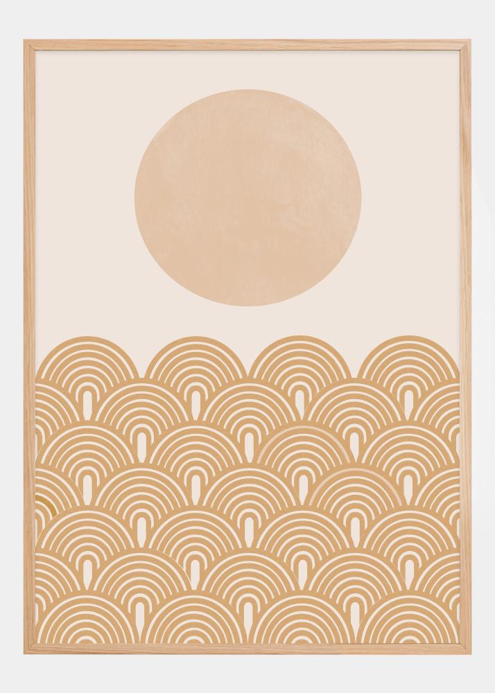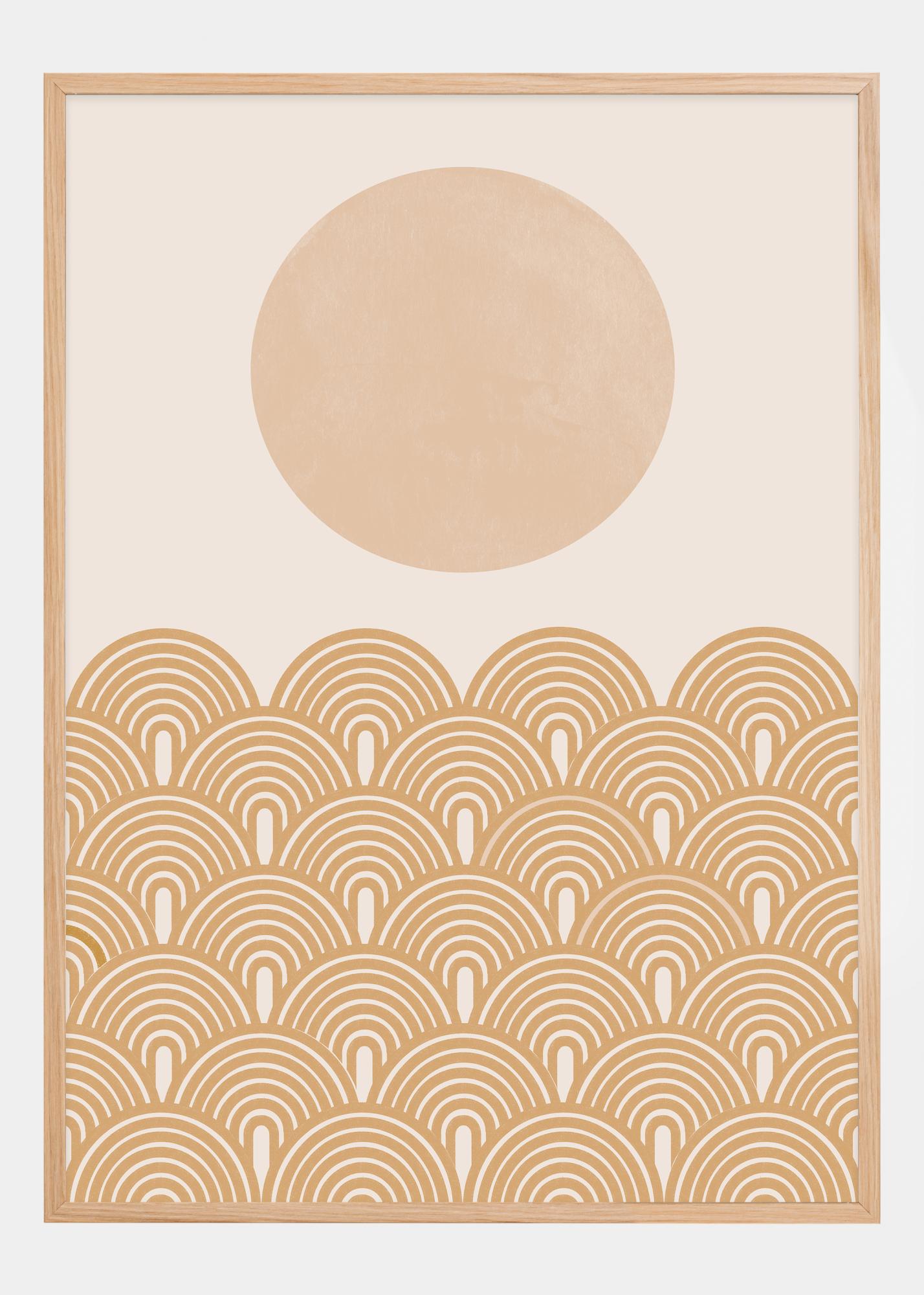 Dieses Poster ist eine sonnige Interpretation von Retro-Stilen und Sommer-Vibes, wobei ein großer blassrosa Kreis über einem Muster von bogenförmigen Elementen in einem warmen Terrakotta-Ton schwebt. Die Bögen sind auf eine Weise miteinander verbunden, die an Wellen oder Hügel erinnert und ein Gefühl von Bewegung und Lebendigkeit vermittelt. Die sanfte Farbgebung trägt zu einem Gefühl von Wärme und Ruhe bei.
