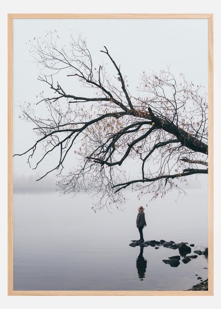 Ein Poster mit Seeblick, das eine Frau zeigt, die auf einem kleinen Steindamm in einem See steht, über dem sich ein Baum biegt. Der weiße See passt zum gleichfarbigen Himmel. Die Frau hebt sich kontrastreich ab, während sie in stiller Kontemplation über das Wasser starrt. Bringen Sie mit diesem Stück Natur Ruhe in Ihr Zuhause.