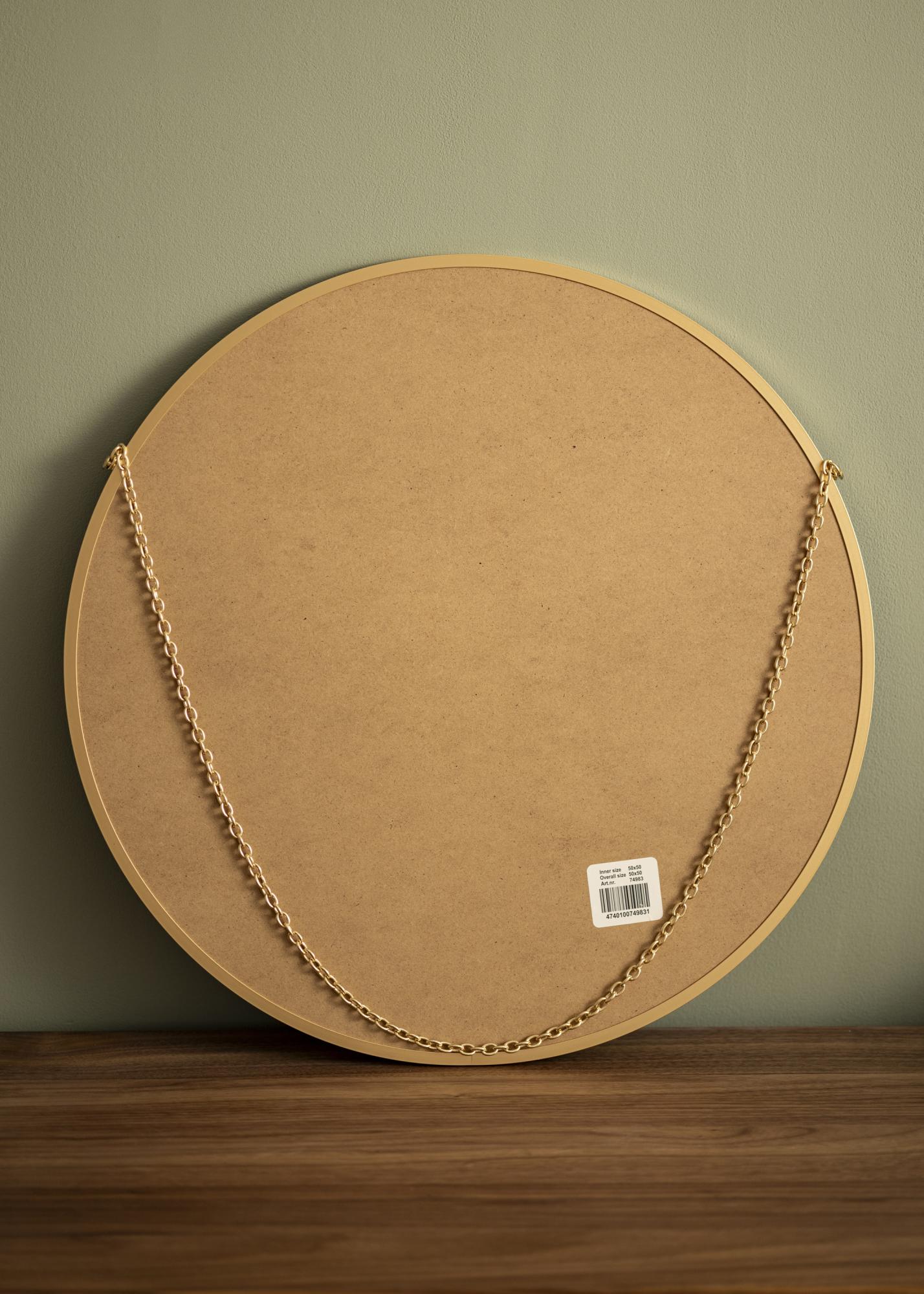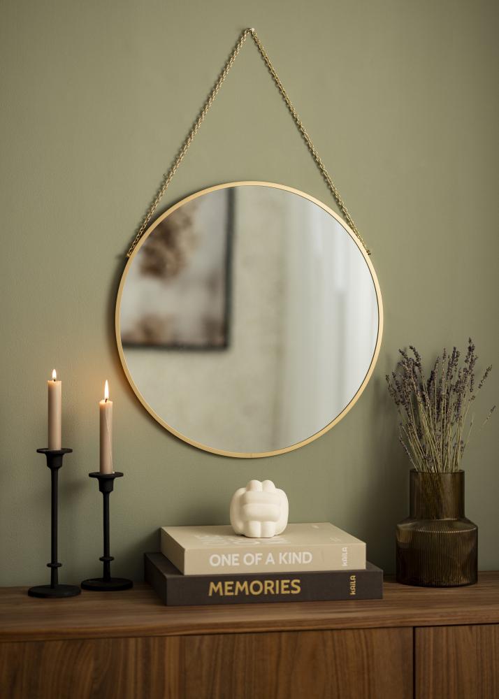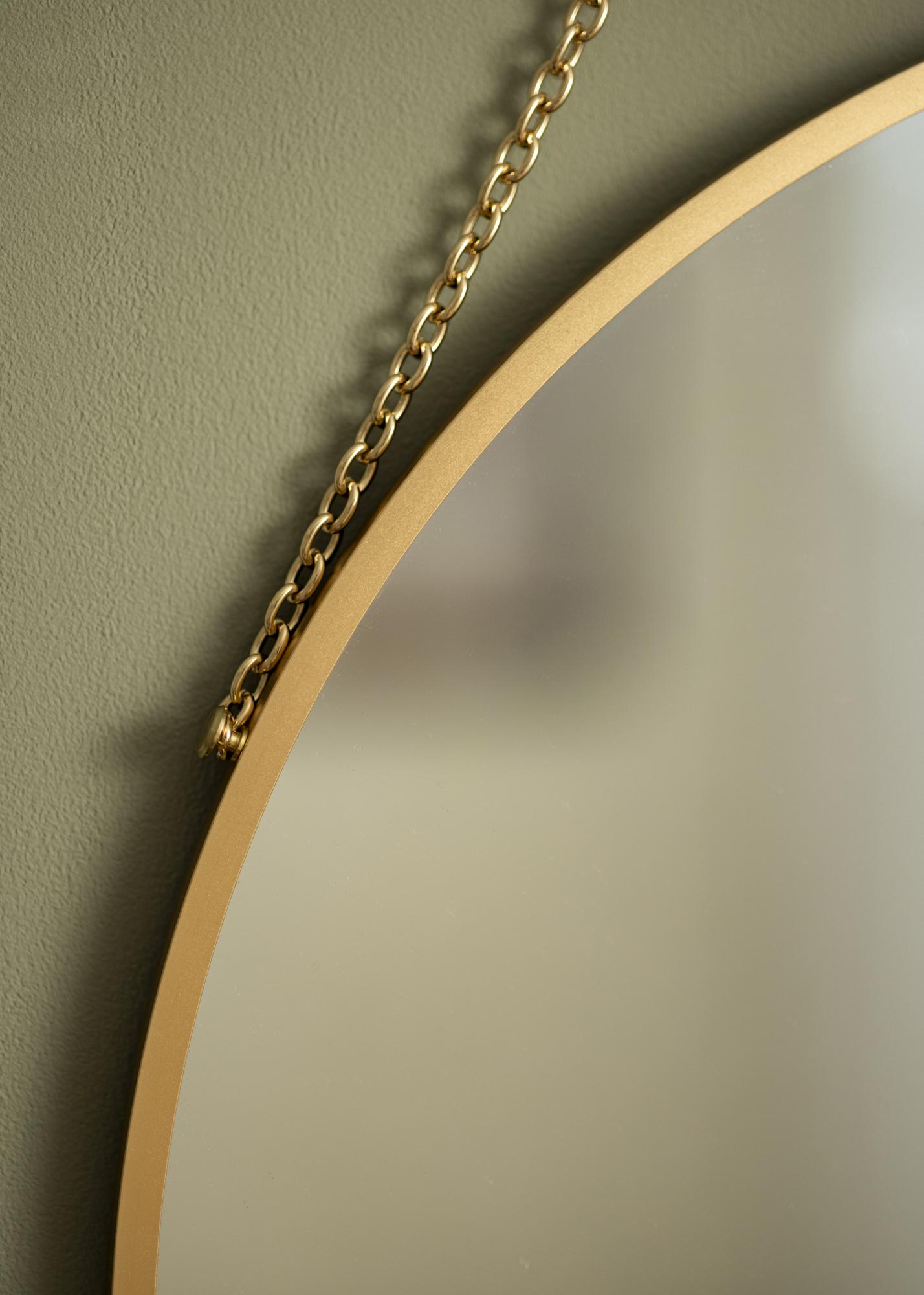 Dieser Wohnspiegel verleiht deinem Zuhause einen Hauch Eleganz! Der Spiegel wirkt mit seiner klassisch runden Form und dem schmalen Spiegelrahmen mit einer Tiefe von nur 8 mm ausgesprochen ausgewogen und formvollendet. Der hübsche Rahmen ist aus Metall gefertigt und in einem exklusiven Goldton gehalten. Der elegante Charakter dieses ansprechenden Wohnspiegels wird durch die goldfarbene Kettenaufhängung zusätzlich verstärkt.