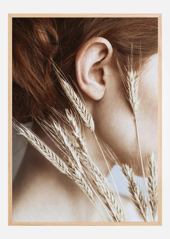 Ein Porträtposter, das das Gesicht einer Frau mit einigen Weizenähren zeigt. Ihr rotes Haar und ihre blasse Haut erinnern an eine Waldgöttin. Betrachten Sie diesen Druck im Stil eines Erntefestes zu Hause.