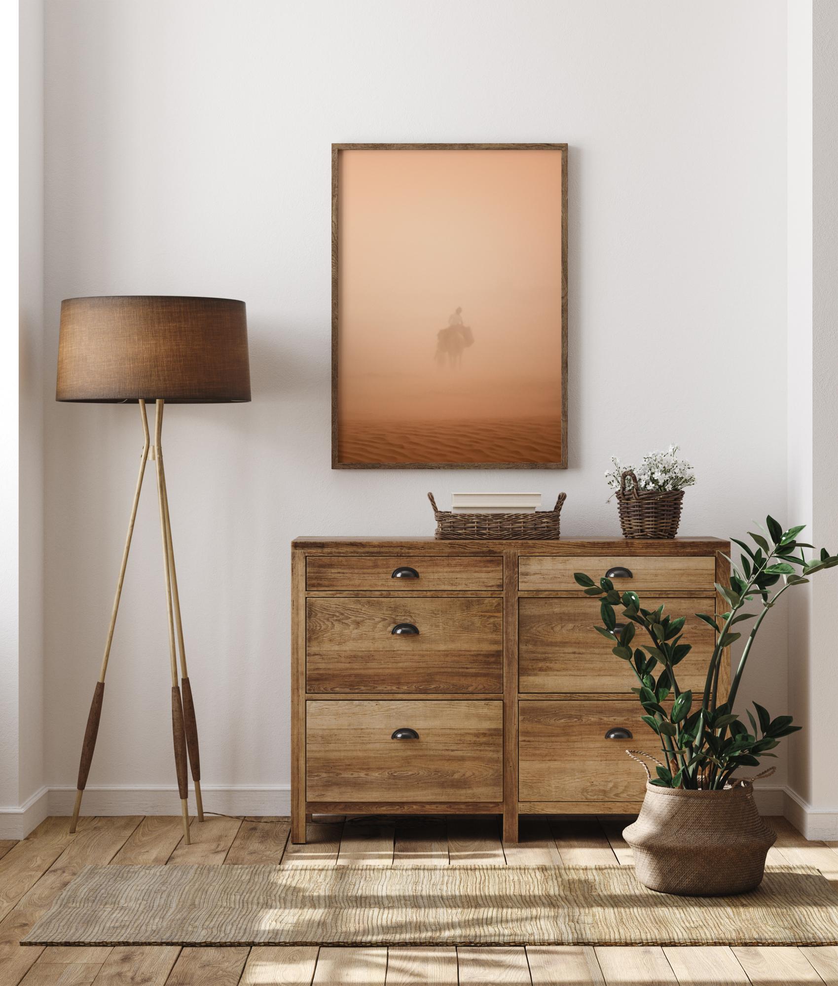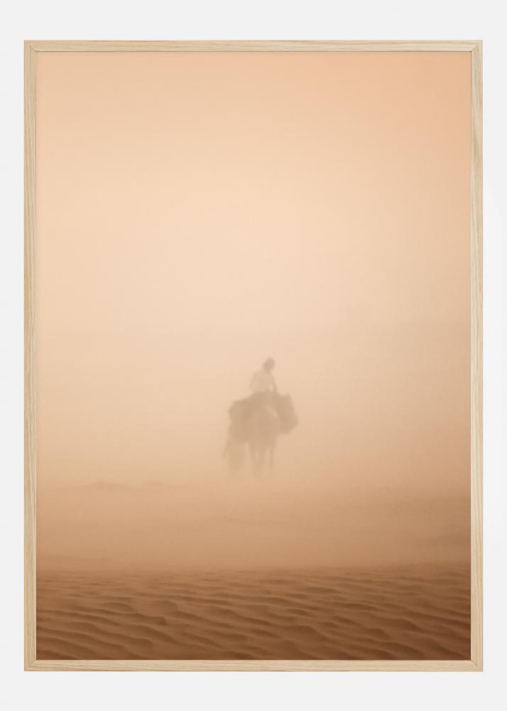 Ein warmes Poster eines Sandsturms. Im Vordergrund ist der Wüstensand zu sehen, bevor er in einem wirbelnden Nebel aus sanften Farben verblasst. In der Mitte ist die schwache Form einer reitenden Figur zu sehen, die sich durch den Sturm kämpft. Spüren Sie die Hitze der Wüste.