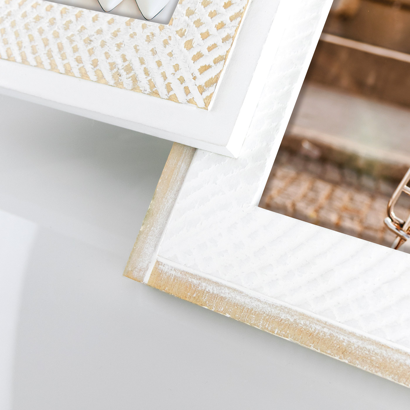 Weißer Collagerahmen aus Holz im Landhausstil, der deine Bilder stilvoll einrahmt und gleichzeitig eine hübsche Wanddekoration ausmacht. Der Collage-Bilderrahmen bietet Platz für 4 Bilder in den Bildformaten 10x10 cm / 10x15 cm / 13x18 cm. Der Collagerahmen ist aus Holz gefertigt, die Außenmaße betragen 38,8x39,8 cm. Der Bilderrahmen ist mit einer Wandhalterung ausgestattet. Collagen und Bilderwände sind immer eine tolle Wanddekoration und eignen sich auch super als persönliches Fotogeschenk für Freunde und Familie.
